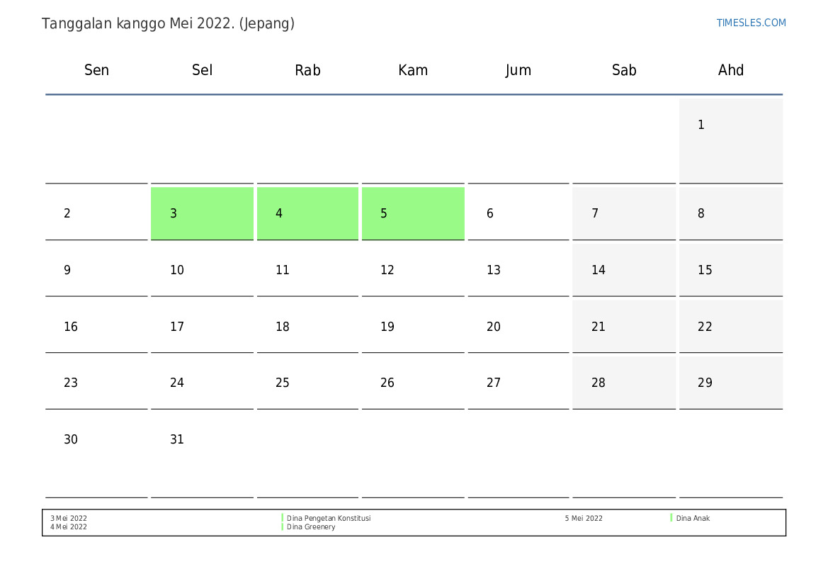 Ngundhuh lan nyithak tanggalan PDF kanthi preinan lan akhir minggu kanggo wulan Mei 2022 kanggo Jepang