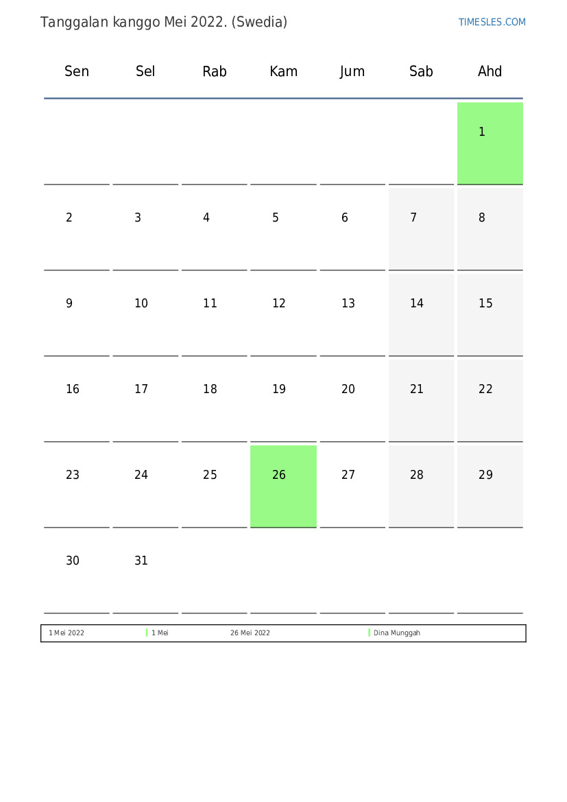 Ngundhuh lan nyithak tanggalan PDF kanthi preinan lan akhir minggu kanggo wulan Mei 2022 kanggo Swedia
