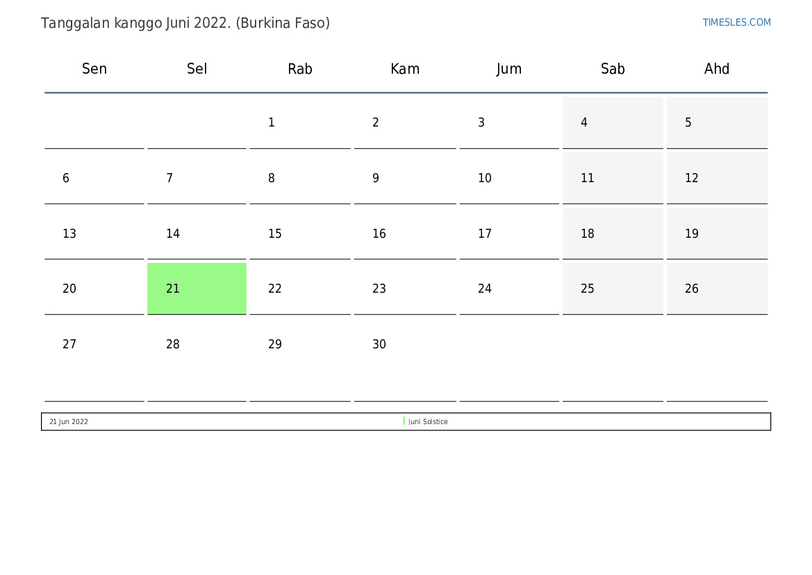 Ngundhuh lan nyithak tanggalan PDF kanthi preinan lan akhir minggu kanggo wulan Juni 2022 kanggo Burkina Faso