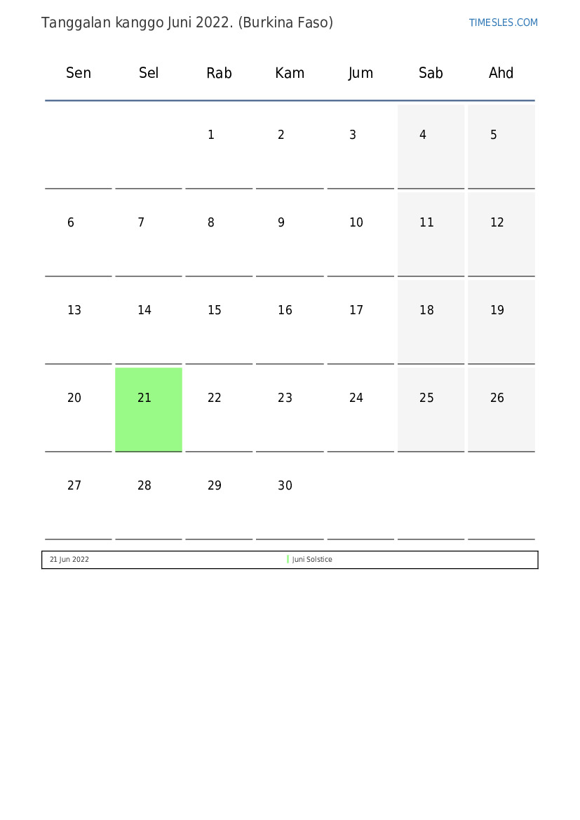 Wulan Juni ngemot 30 dina. Iki umure 6 wulan 2022. Mangsa taun: panas. Wulan Juni diwiwiti dina Rebo lan dina Kemis. Ing wulan Juni 2022, ana 1 preinan lan dina dina ing Burkina Faso.
