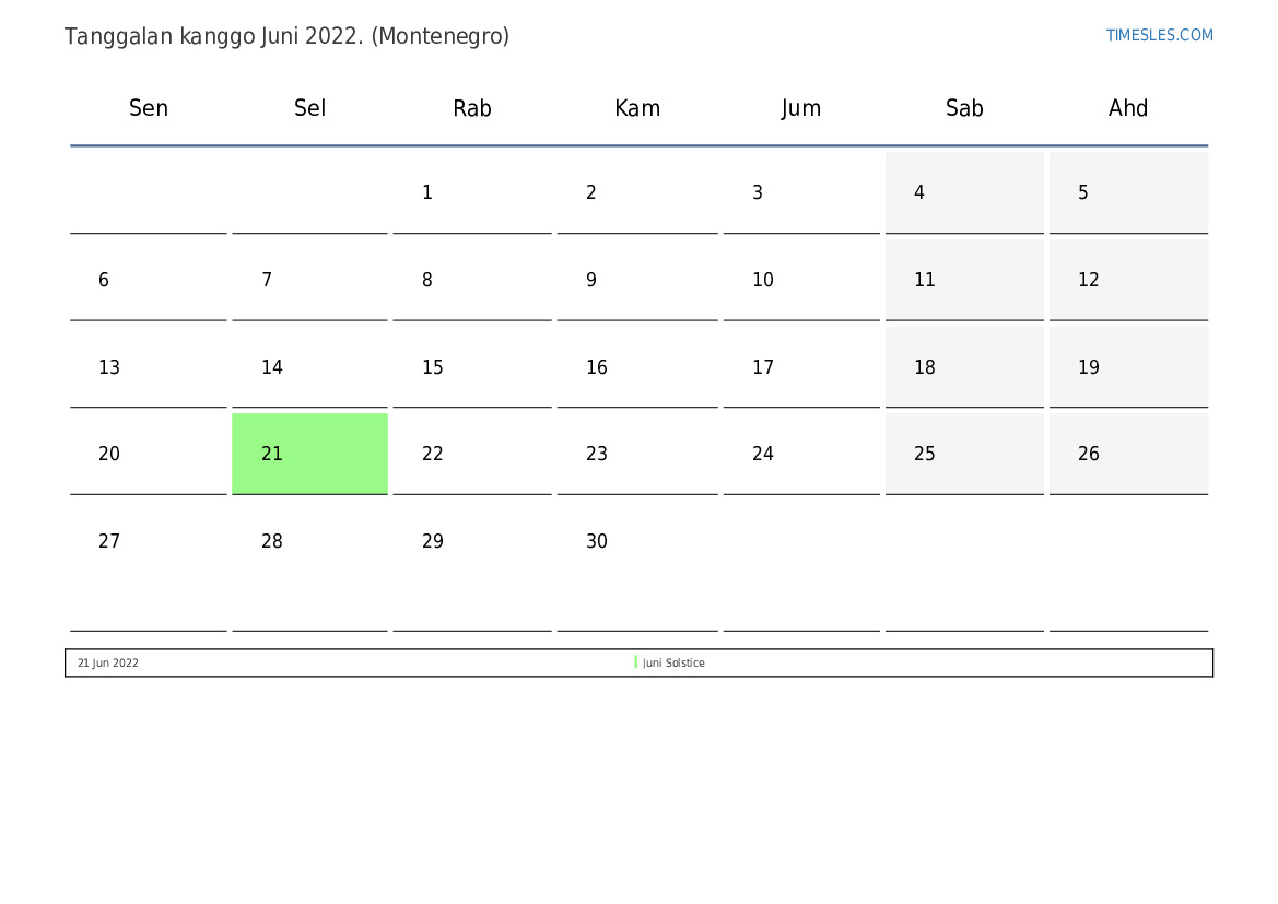 Ngundhuh lan nyithak tanggalan PDF kanthi preinan lan akhir minggu kanggo wulan Juni 2022 kanggo Montenegro