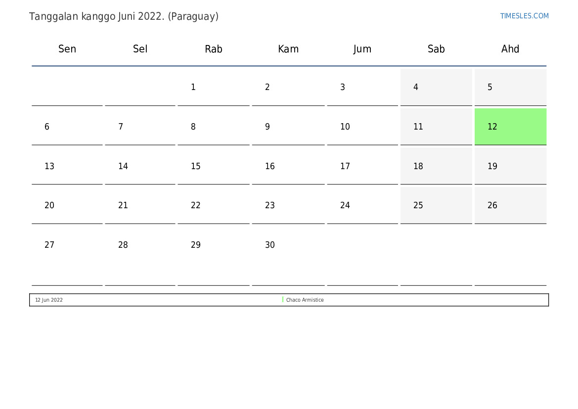 Ngundhuh lan nyithak tanggalan PDF kanthi preinan lan akhir minggu kanggo wulan Juni 2022 kanggo Paraguay
