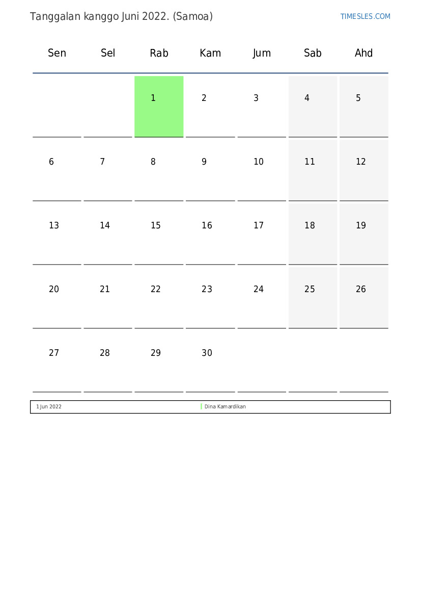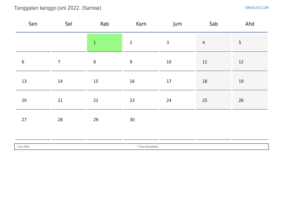 Ngundhuh lan nyithak tanggalan PDF kanthi preinan lan akhir minggu kanggo wulan Juni 2022 kanggo Samoa