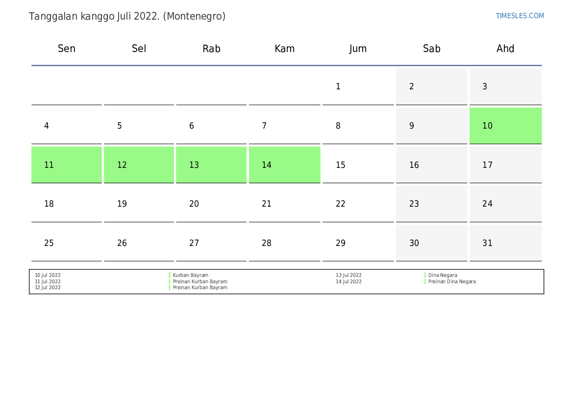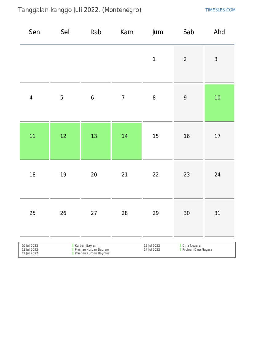 Kalender Liburan lan Akhir minggu kanggo wulan Juli 2022 kanggo Montenegro