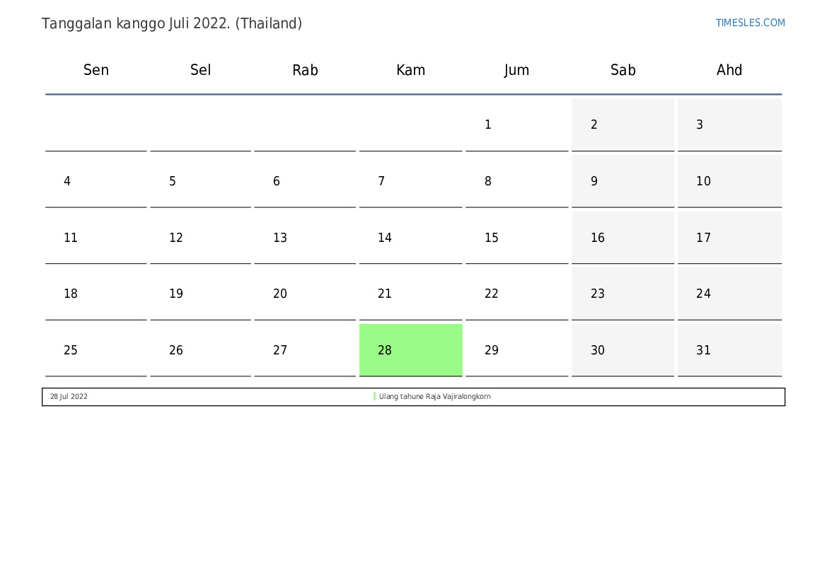 Ngundhuh lan nyithak tanggalan PDF kanthi preinan lan akhir minggu kanggo wulan Juli 2022 kanggo Thailand
