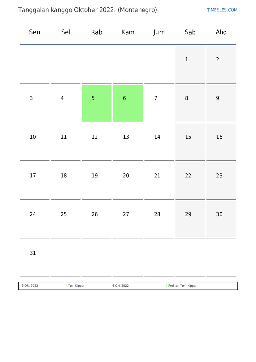 Ngundhuh lan nyithak tanggalan PDF kanthi preinan lan akhir minggu kanggo wulan Oktober 2022 kanggo Montenegro