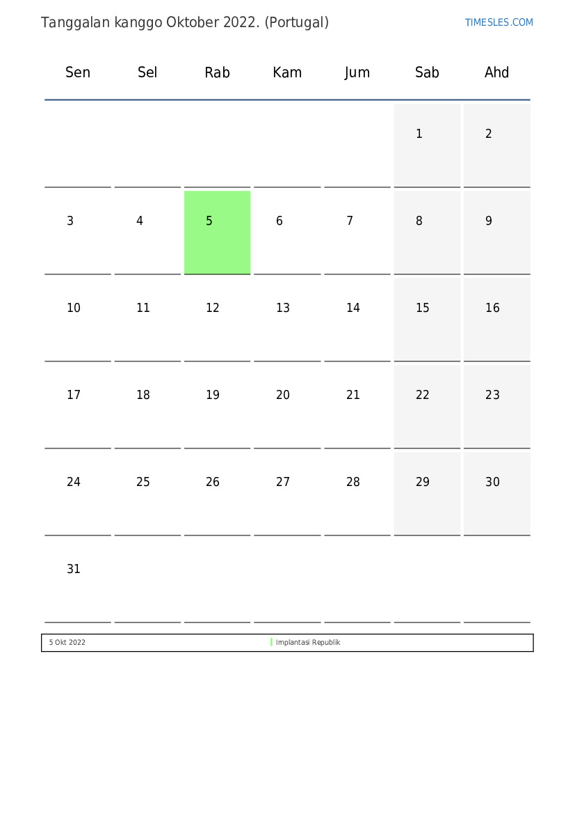 Ngundhuh lan nyithak tanggalan PDF kanthi preinan lan akhir minggu kanggo wulan Oktober 2022 kanggo Portugal