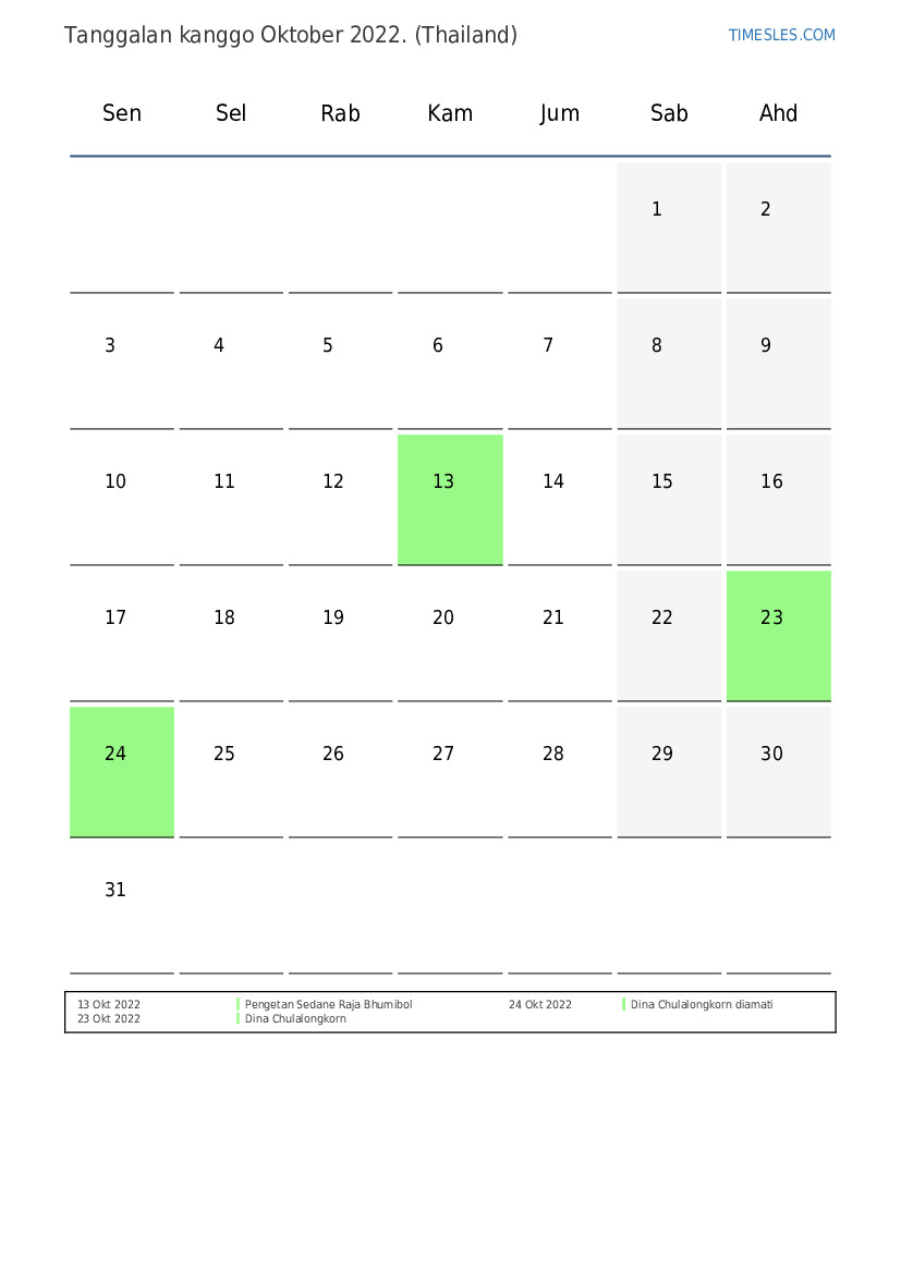Kalender Liburan lan Akhir minggu kanggo wulan Oktober 2022 kanggo Thailand