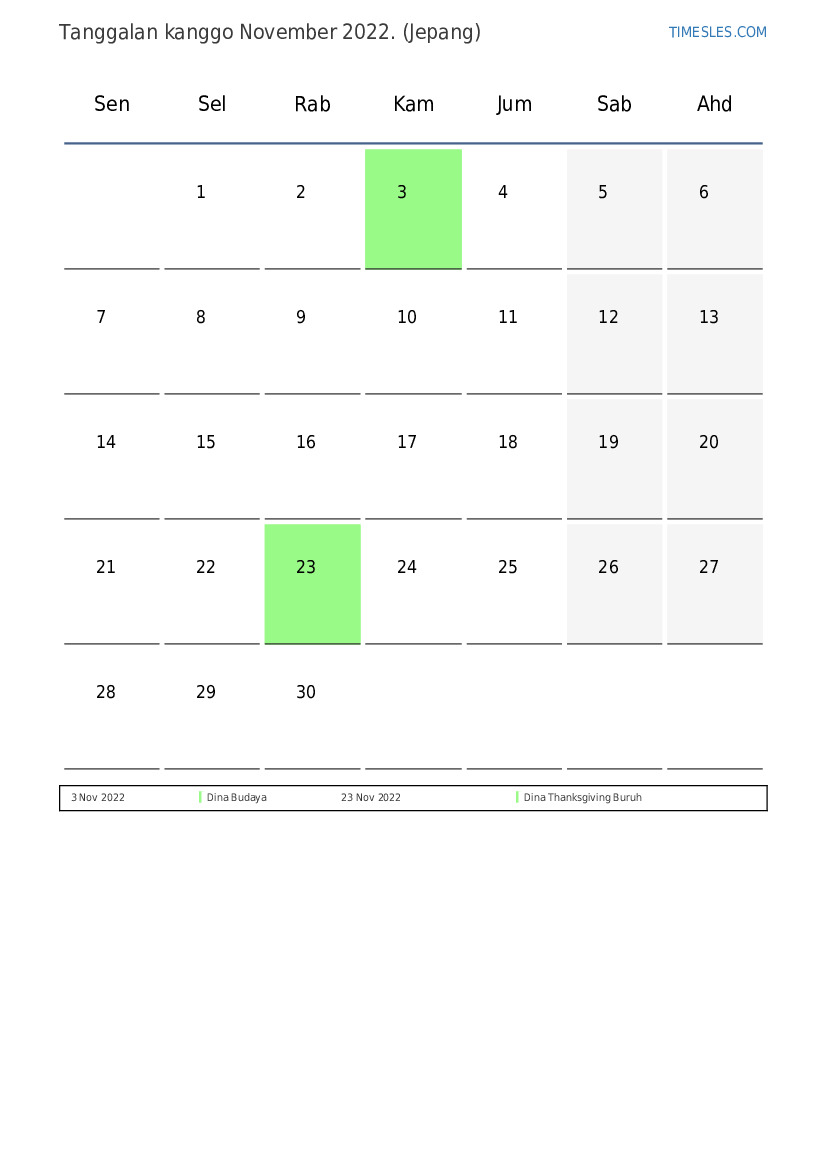 Ngundhuh lan nyithak tanggalan PDF kanthi preinan lan akhir minggu kanggo wulan November 2022 kanggo Jepang