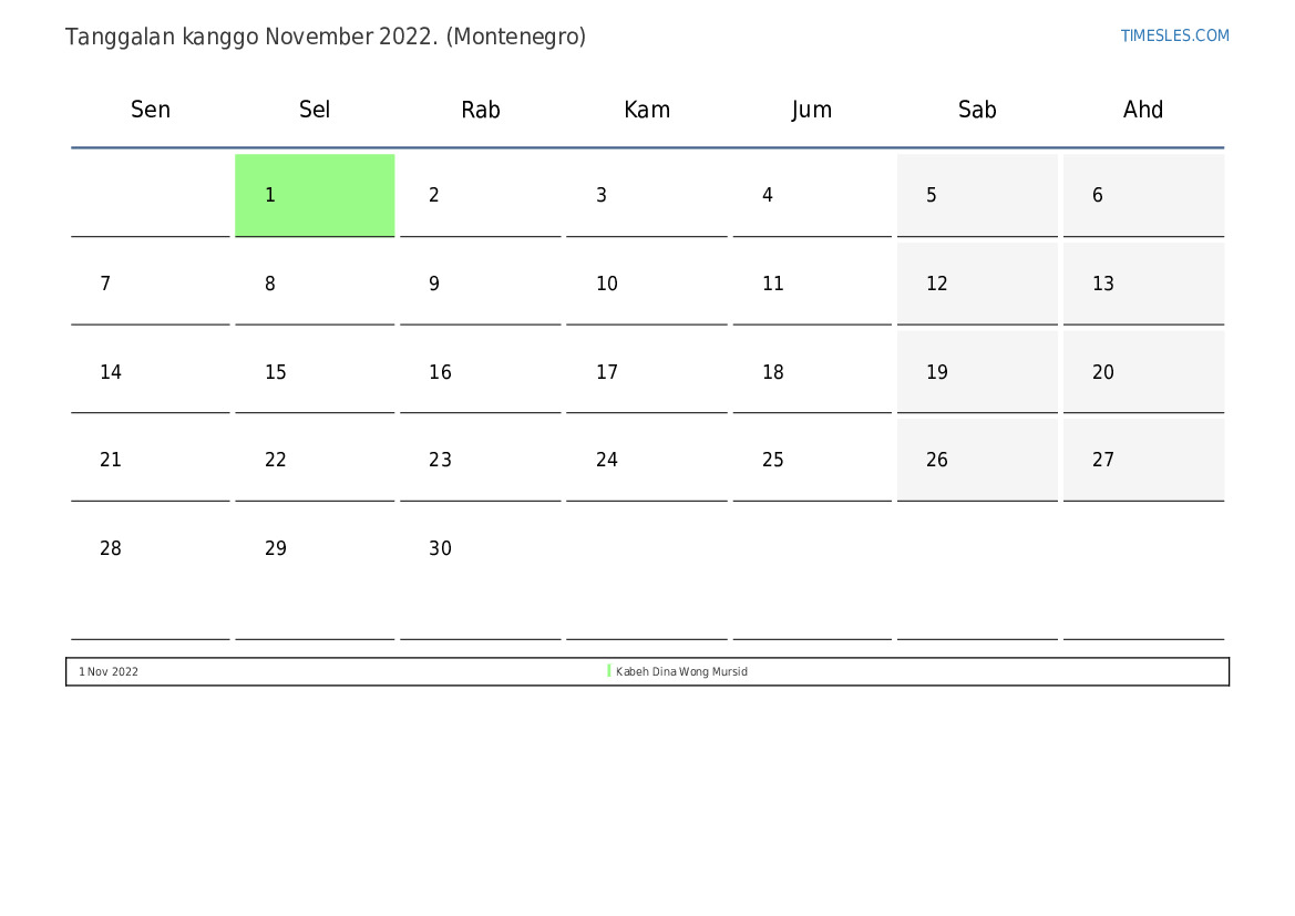 Ngundhuh lan nyithak tanggalan PDF kanthi preinan lan akhir minggu kanggo wulan November 2022 kanggo Montenegro