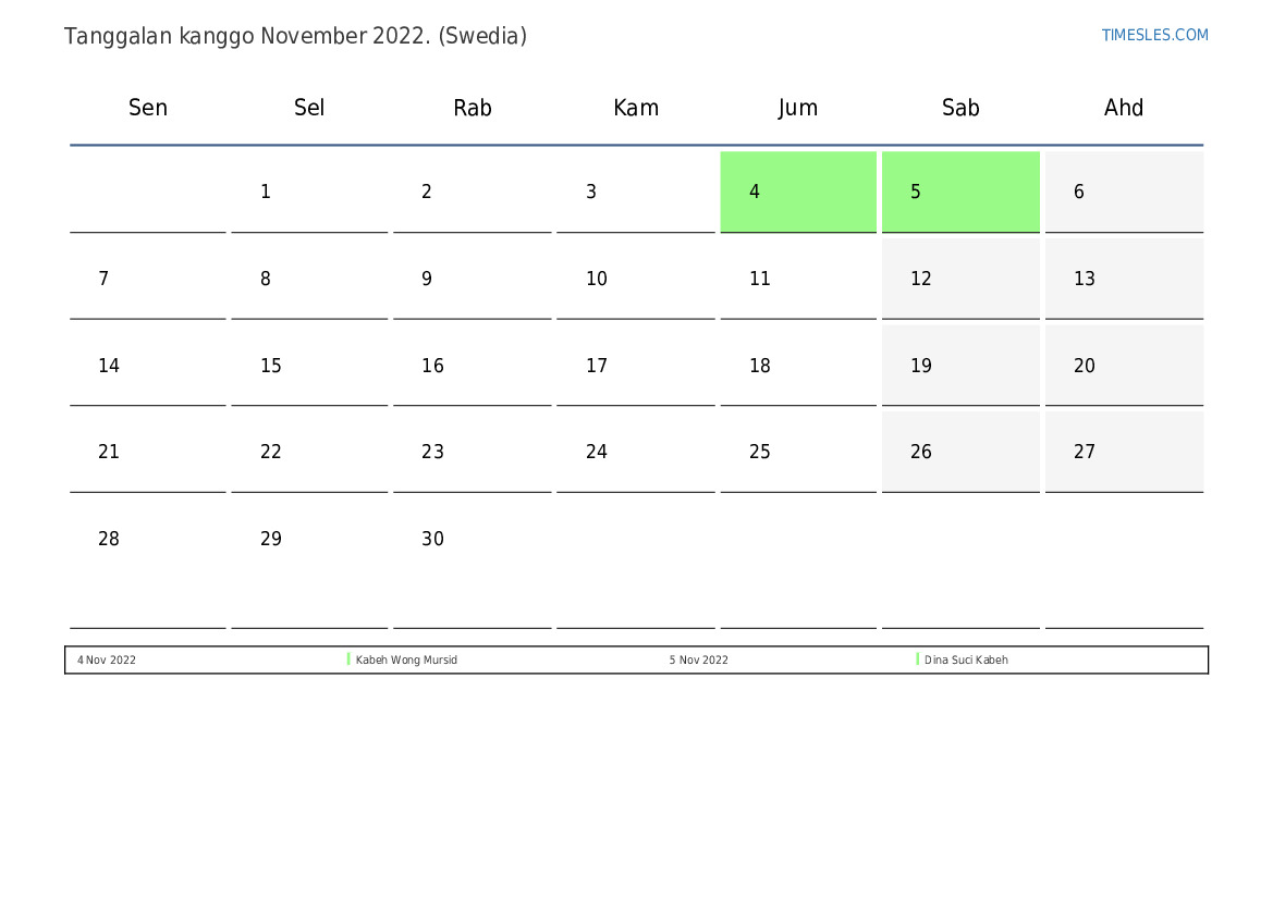 Ngundhuh lan nyithak tanggalan PDF kanthi preinan lan akhir minggu kanggo wulan November 2022 kanggo Swedia