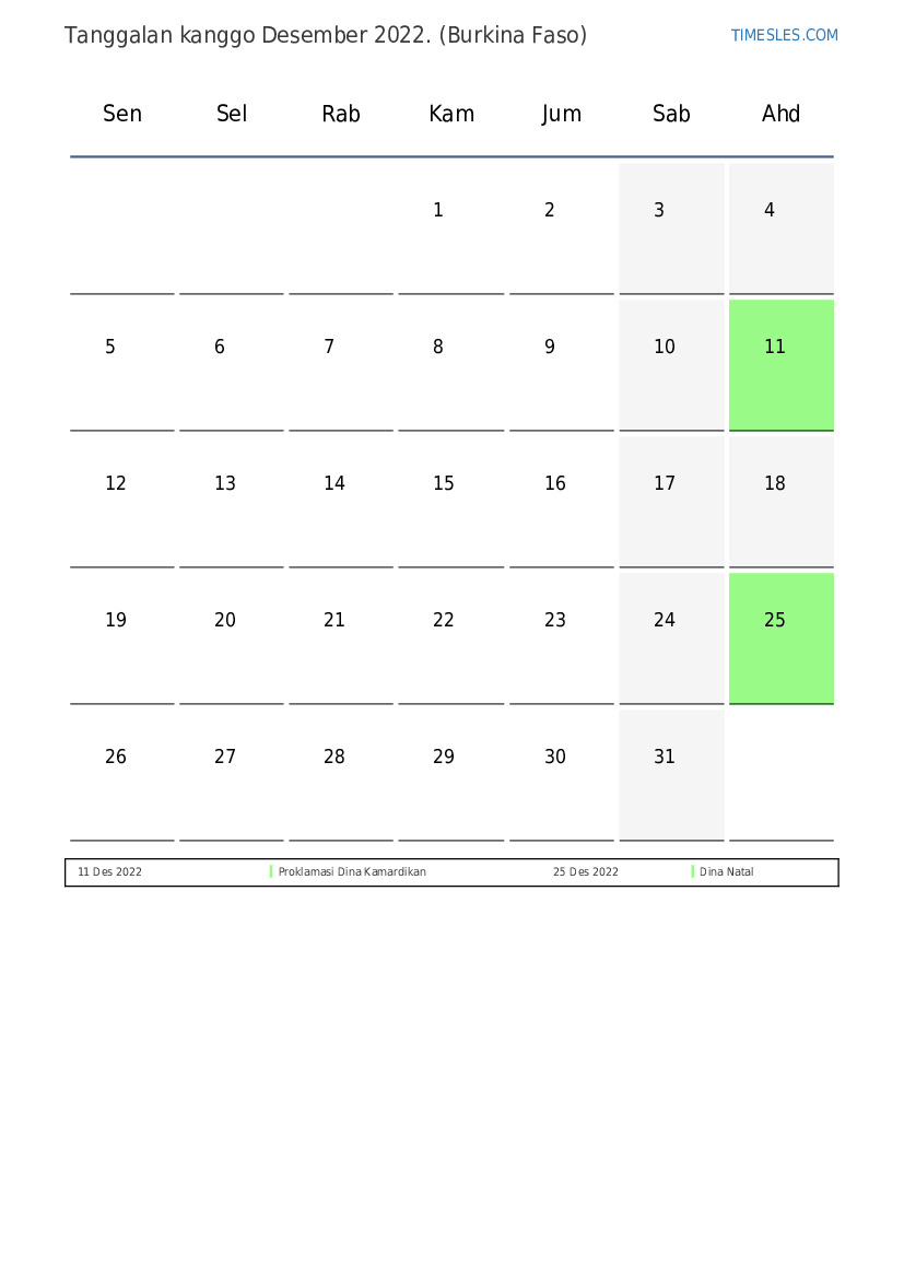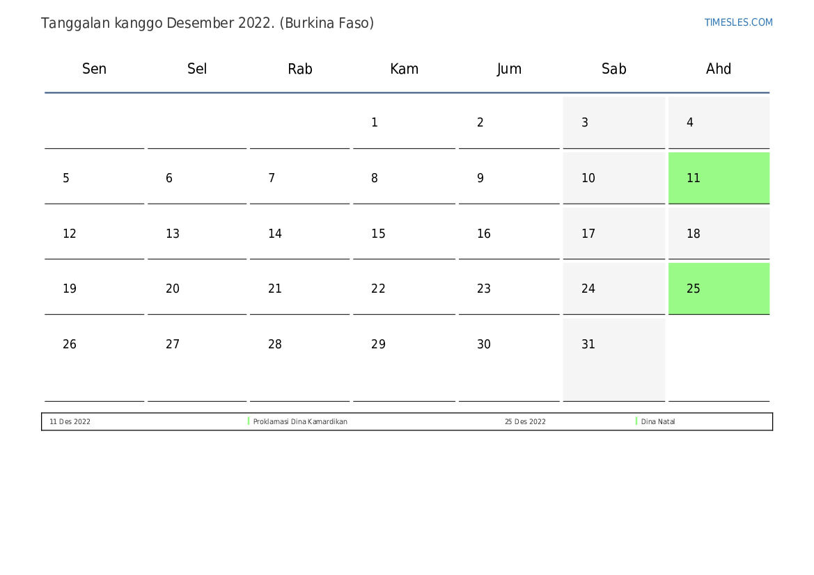 Tanggalan Desember 2022 kanggo Burkina Faso