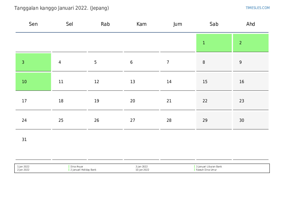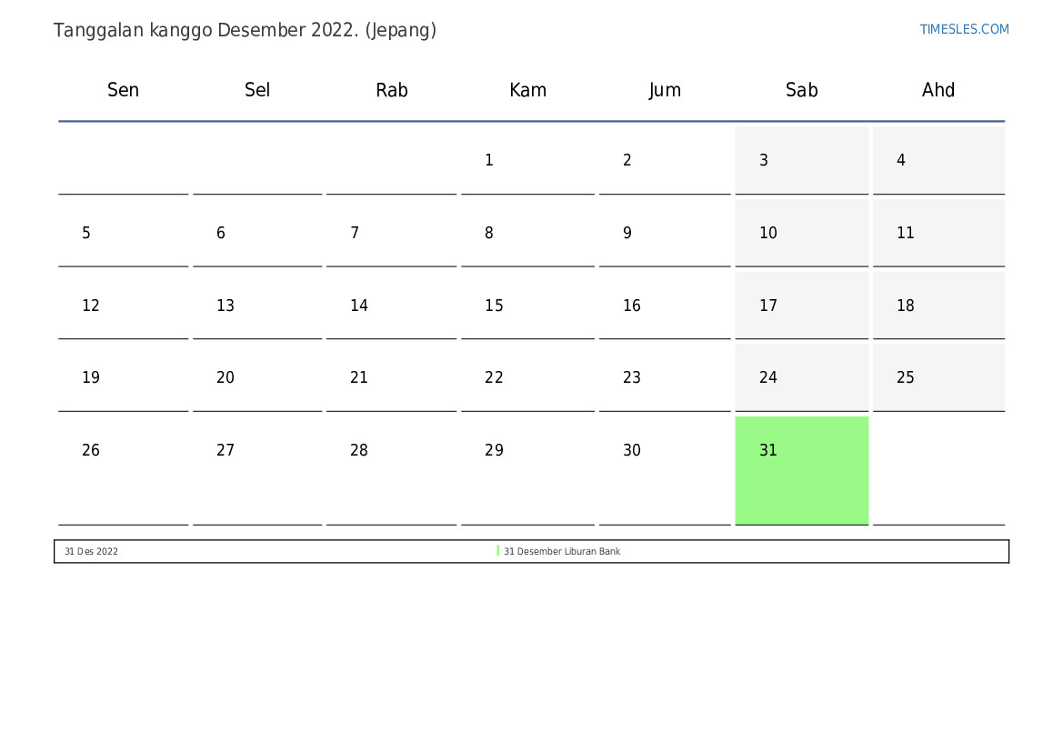 Ngundhuh lan nyithak tanggalan PDF kanthi preinan lan akhir minggu kanggo wulan Desember 2022 kanggo Jepang
