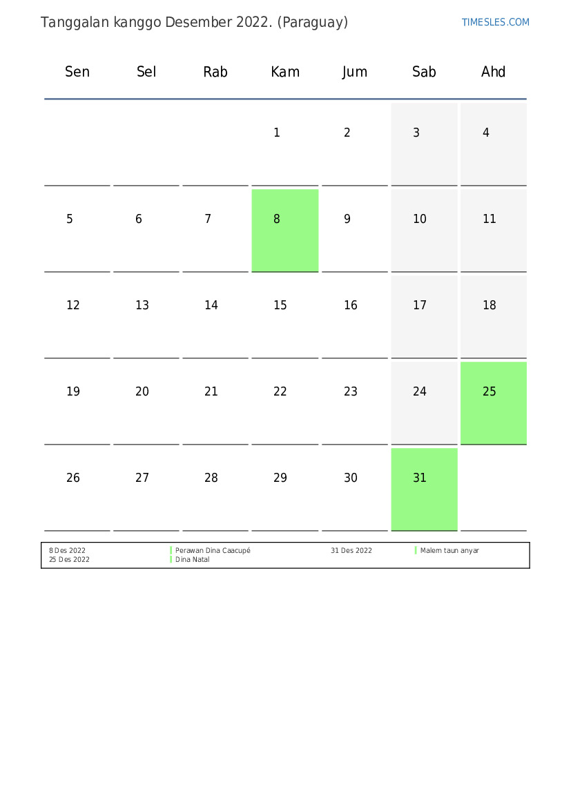Ngundhuh lan nyithak tanggalan PDF kanthi preinan lan akhir minggu kanggo wulan Desember 2022 kanggo Paraguay