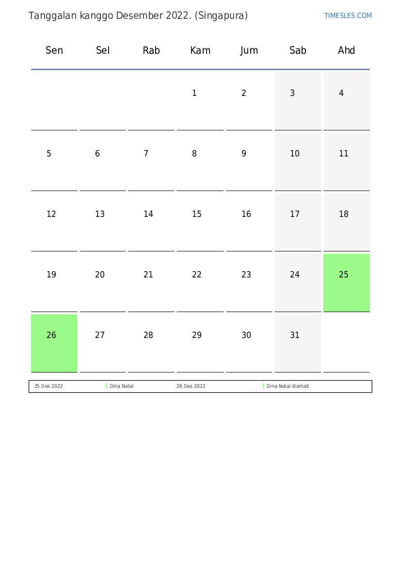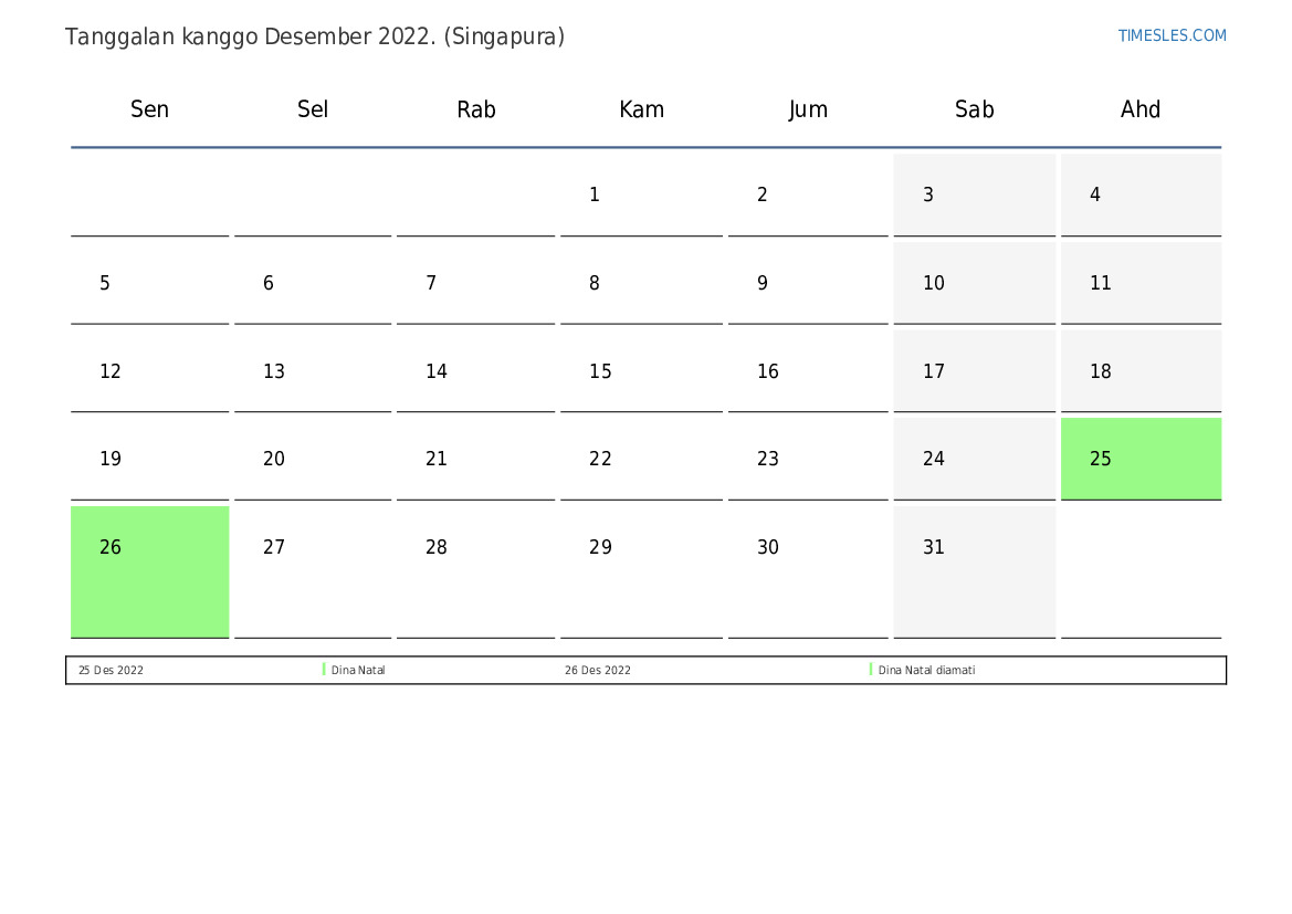 Ngundhuh lan nyithak tanggalan PDF kanthi preinan lan akhir minggu kanggo wulan Desember 2022 kanggo Singapura