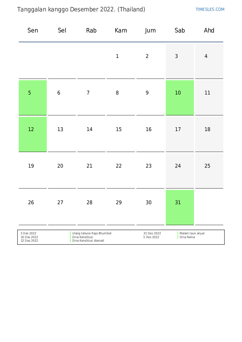 Ngundhuh lan nyithak tanggalan PDF kanthi preinan lan akhir minggu kanggo wulan Desember 2022 kanggo Thailand