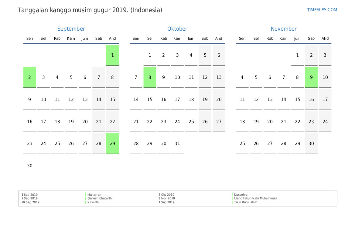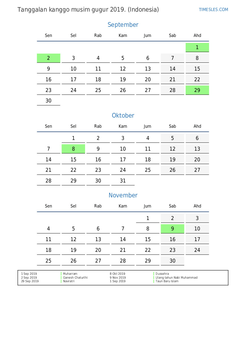 Download lan nyithak tanggalan PDF kanthi preinan lan akhir minggu kanggo musim gugur taun 2019 kanggo Indonesia
