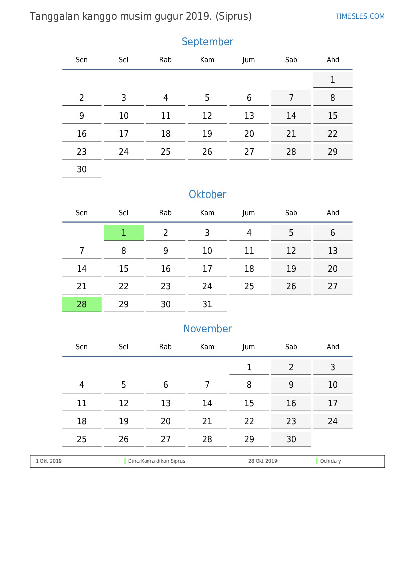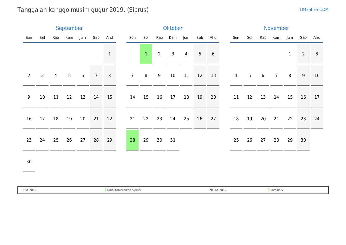 Download lan nyithak tanggalan PDF kanthi preinan lan akhir minggu kanggo musim gugur taun 2019 kanggo Siprus