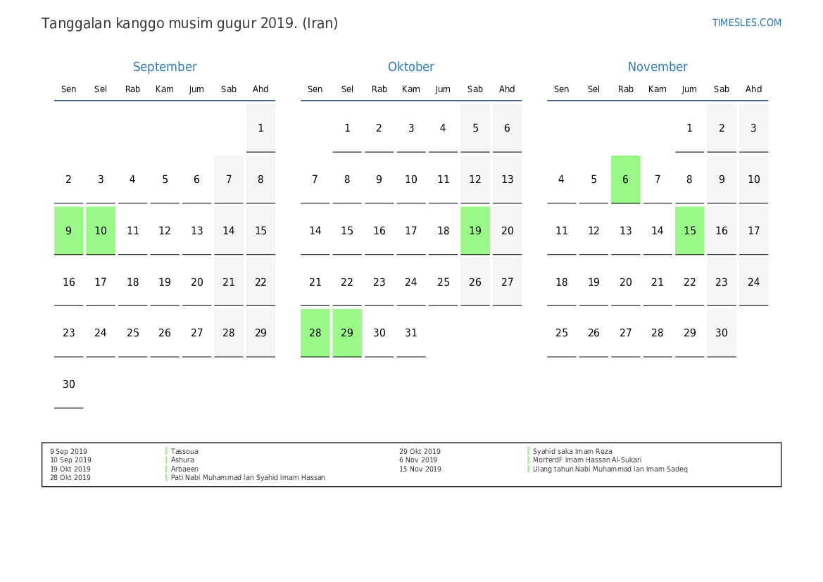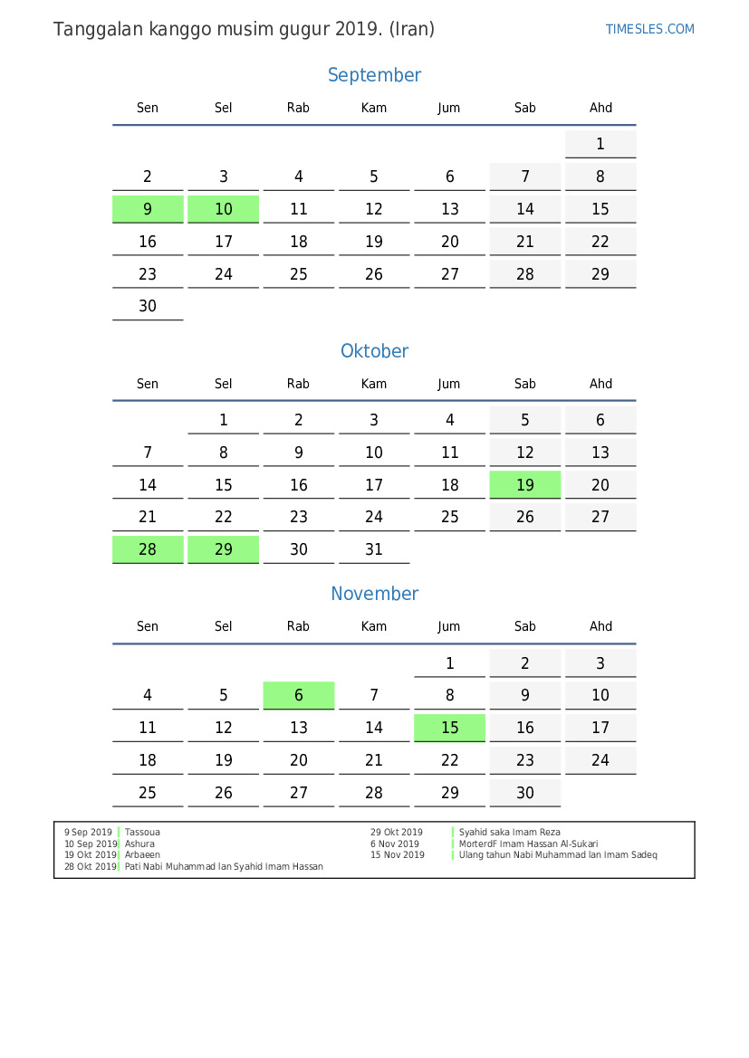 Download lan nyithak tanggalan PDF kanthi preinan lan akhir minggu kanggo musim gugur taun 2019 kanggo Iran