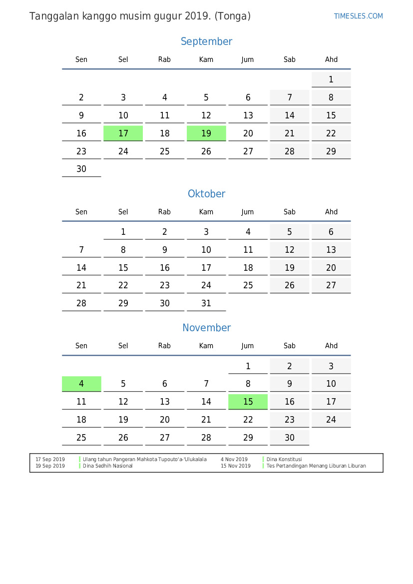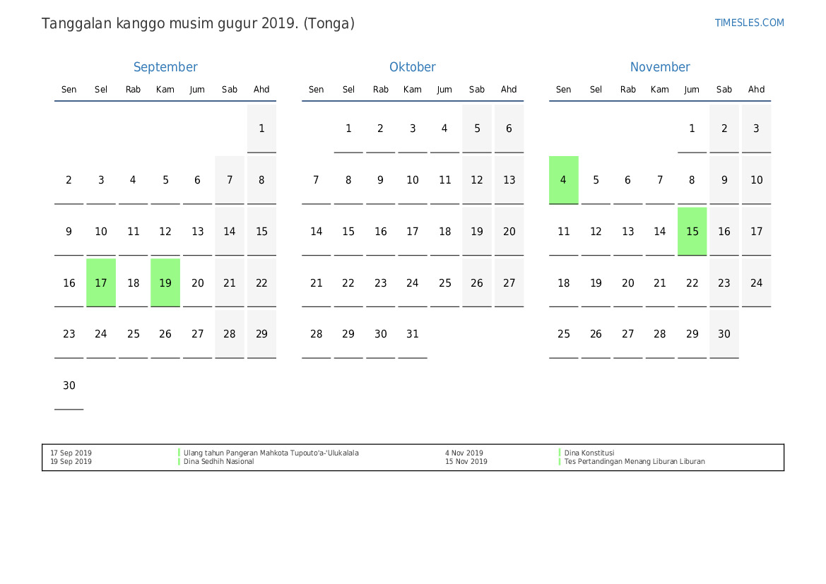Download lan nyithak tanggalan PDF kanthi preinan lan akhir minggu kanggo musim gugur taun 2019 kanggo Tonga