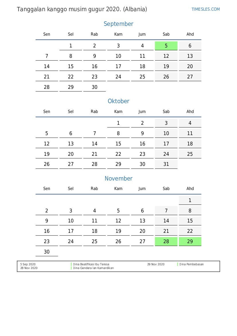 Download lan nyithak tanggalan PDF kanthi preinan lan akhir minggu kanggo musim gugur taun 2020 kanggo Albania