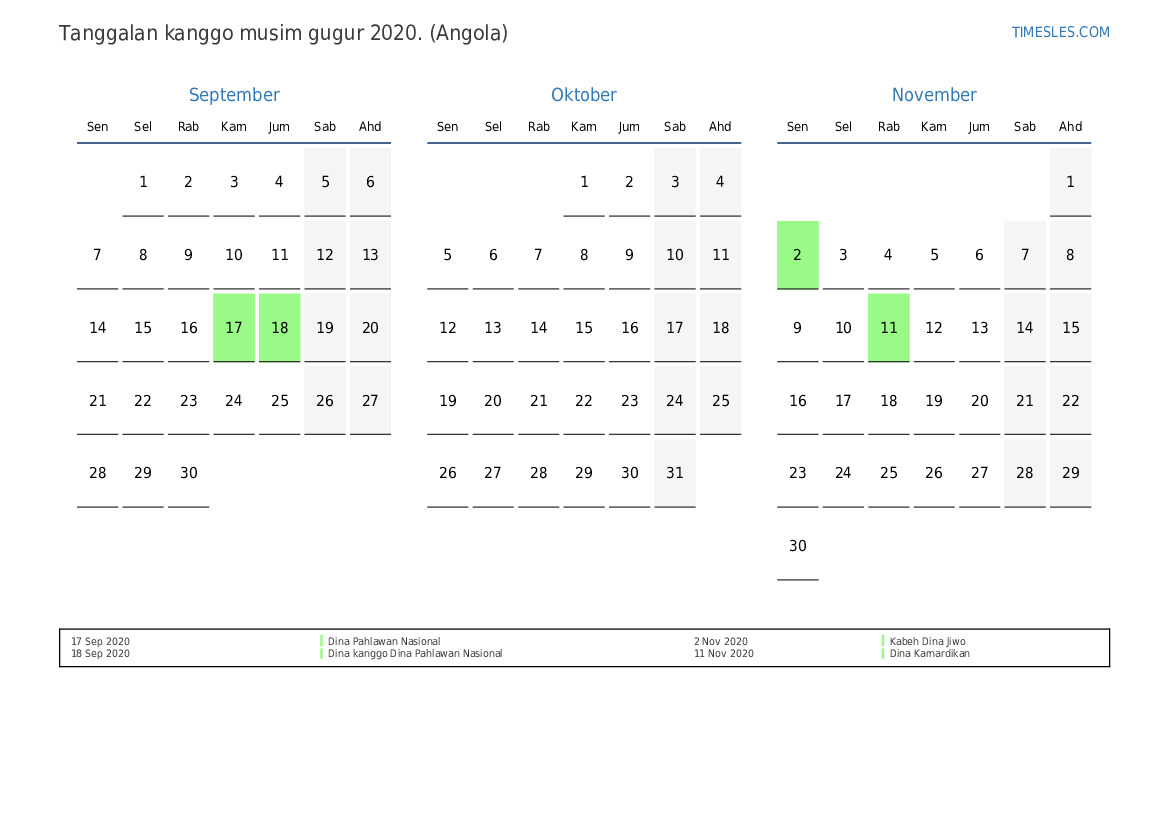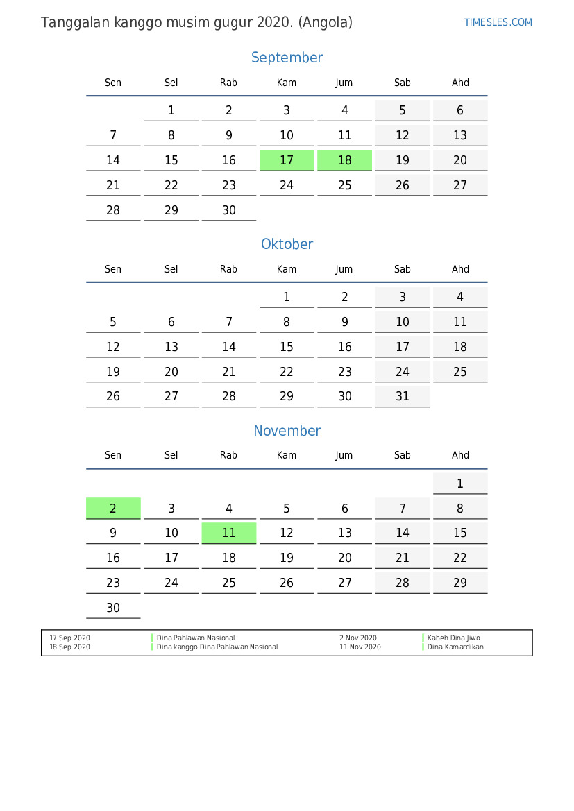Download lan nyithak tanggalan PDF kanthi preinan lan akhir minggu kanggo musim gugur taun 2020 kanggo Angola
