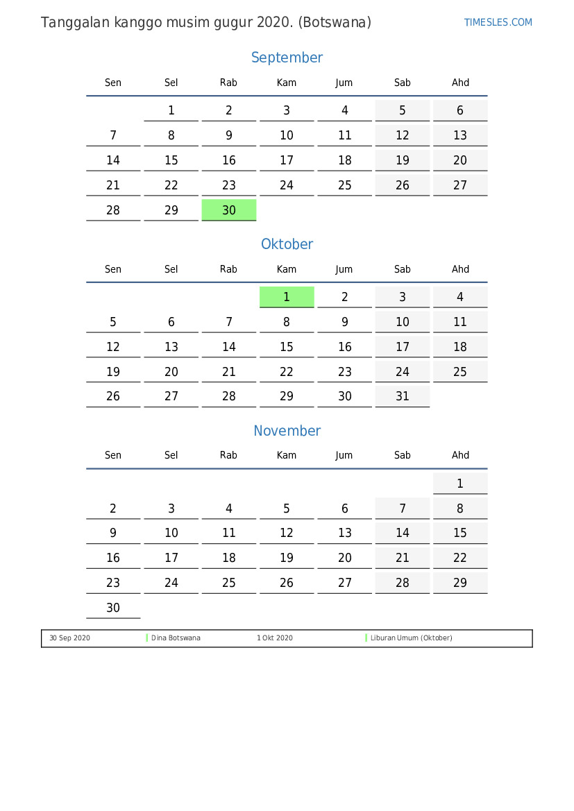 Download lan nyithak tanggalan PDF kanthi preinan lan akhir minggu kanggo musim gugur taun 2020 kanggo Botswana