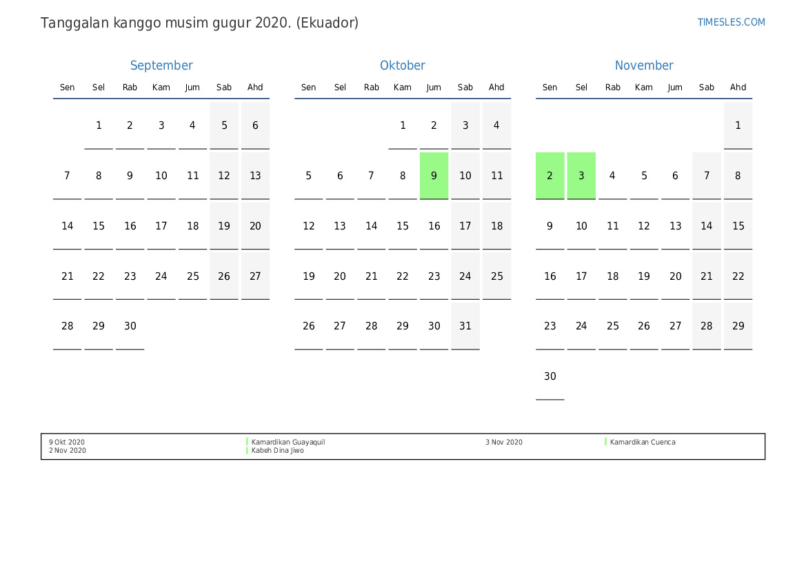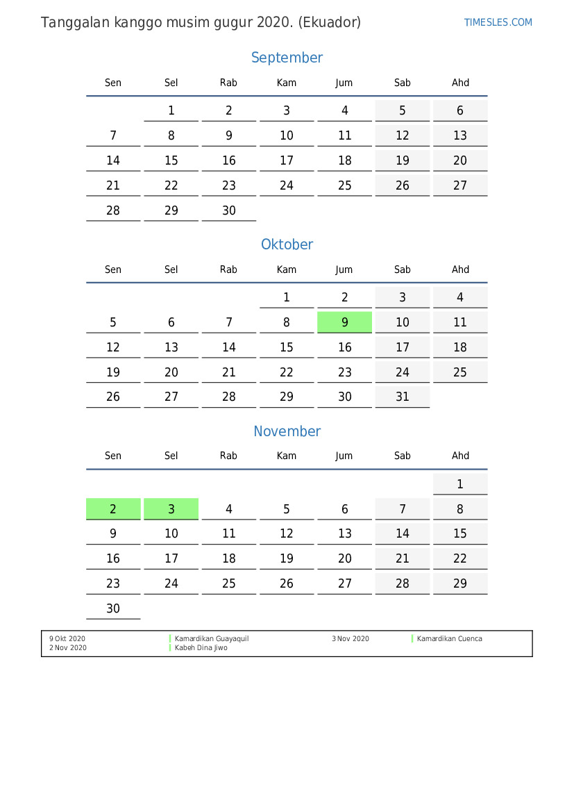 Download lan nyithak tanggalan PDF kanthi preinan lan akhir minggu kanggo musim gugur taun 2020 kanggo Ekuador
