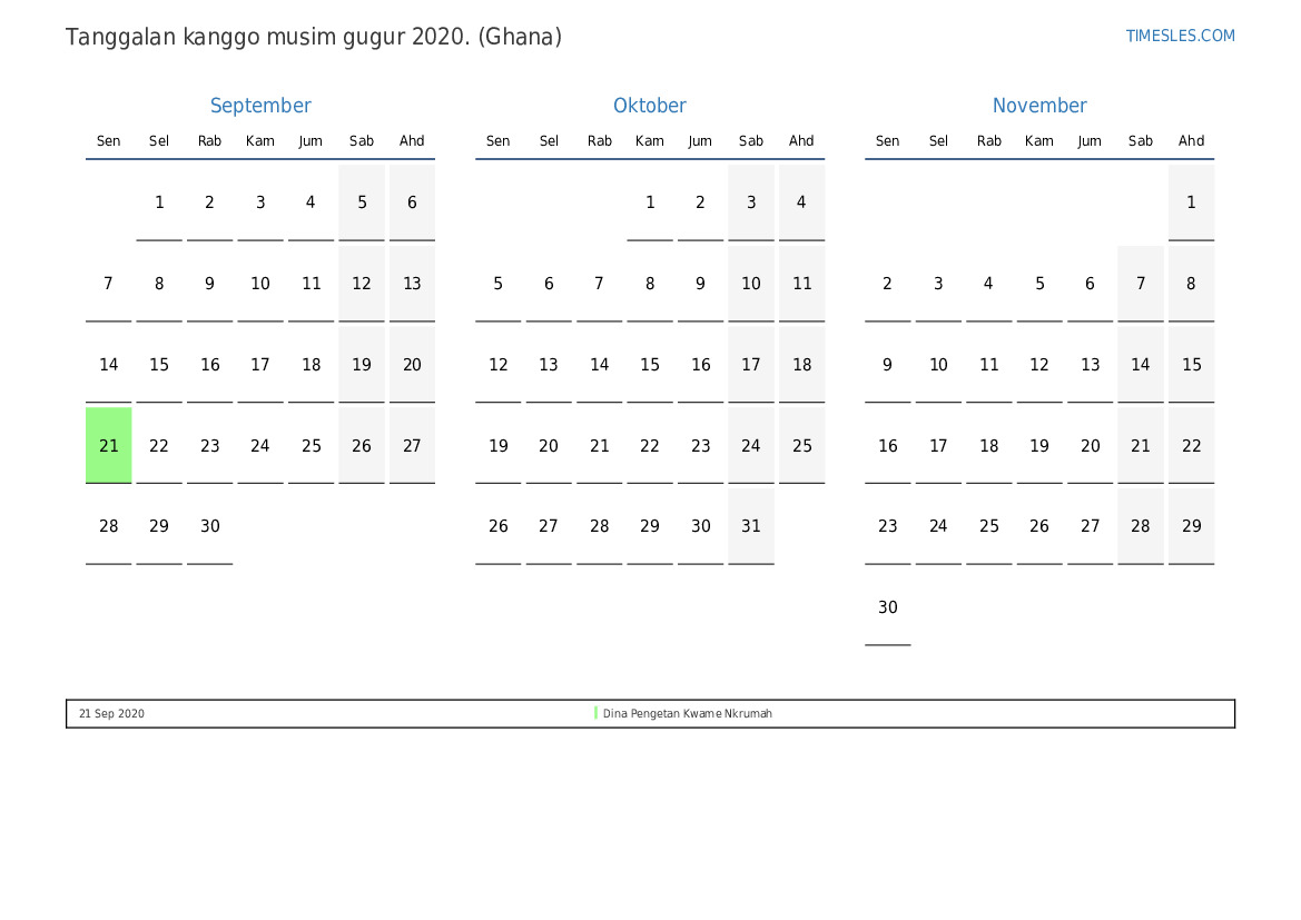 Download lan nyithak tanggalan PDF kanthi preinan lan akhir minggu kanggo musim gugur taun 2020 kanggo Ghana