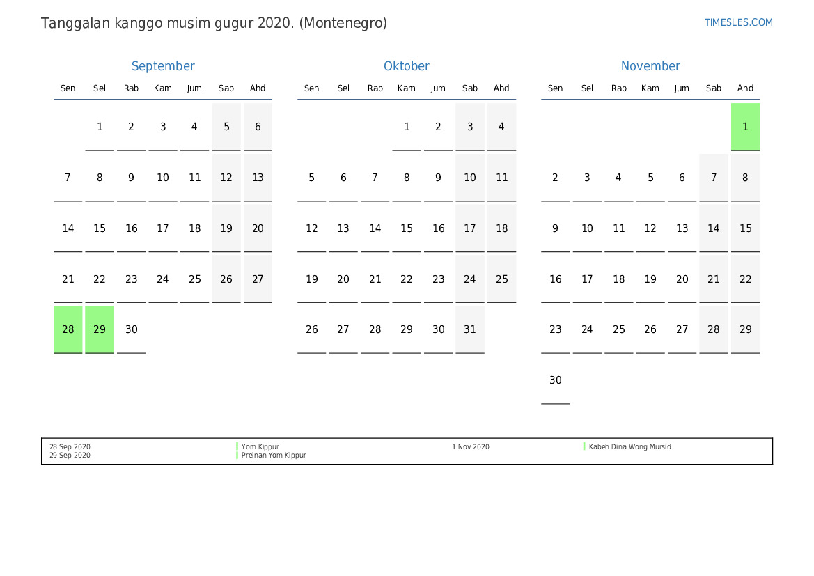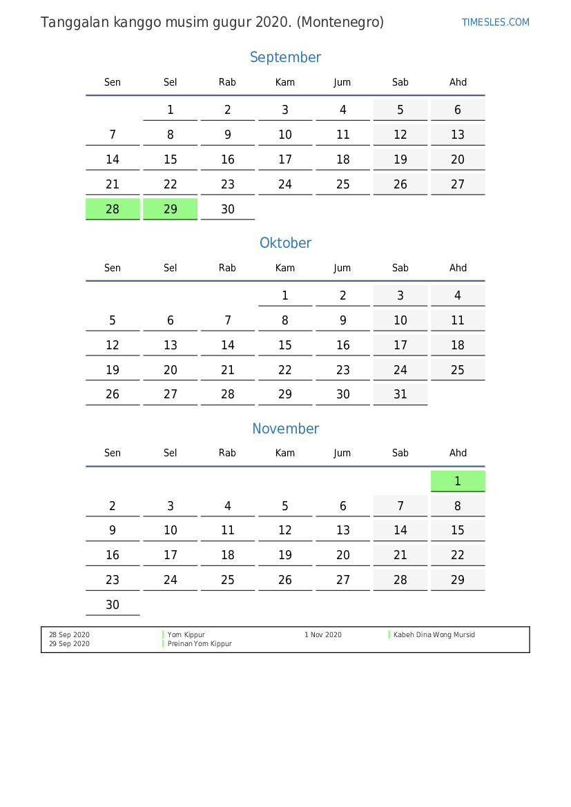 Download lan nyithak tanggalan PDF kanthi preinan lan akhir minggu kanggo musim gugur taun 2020 kanggo Montenegro