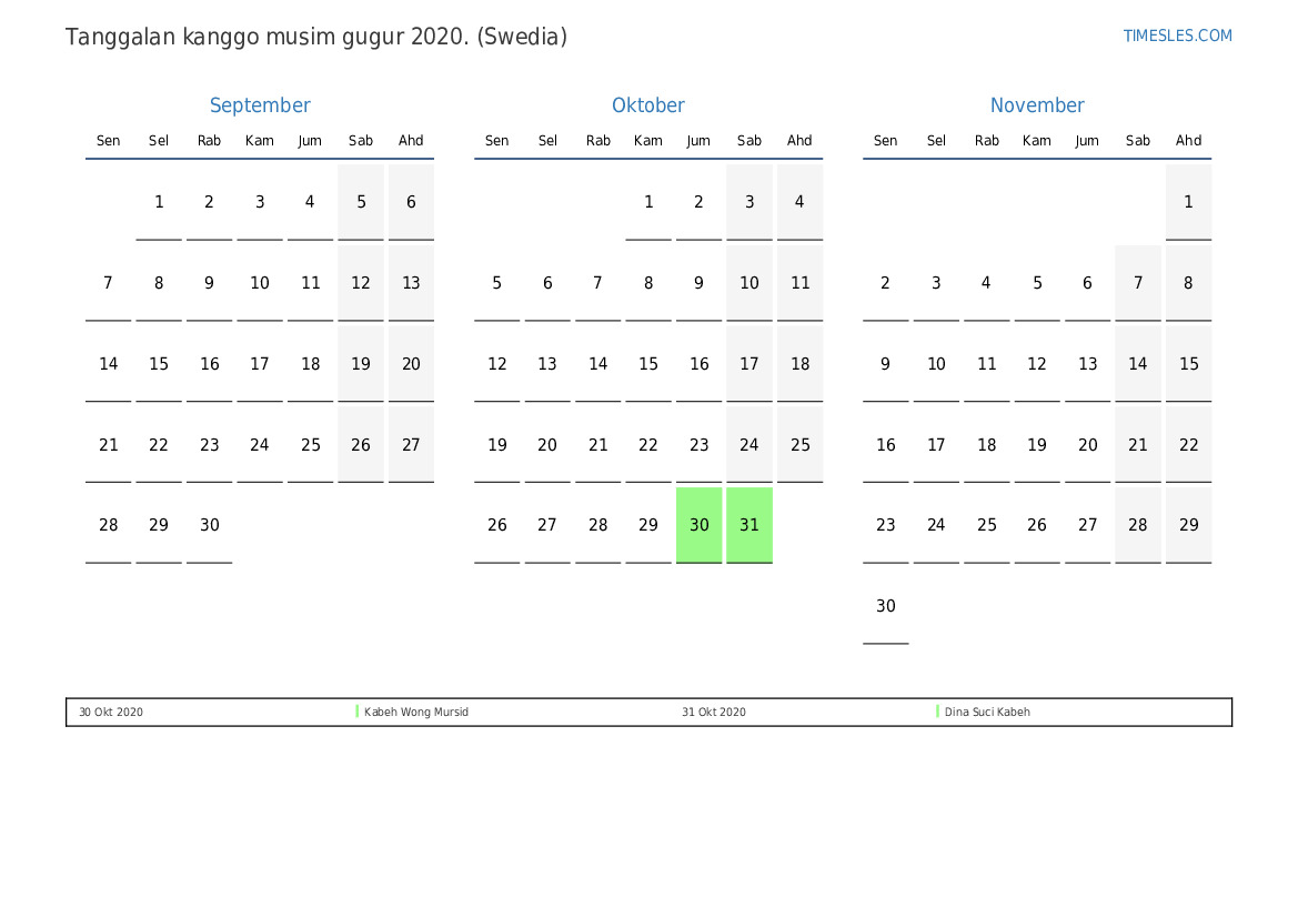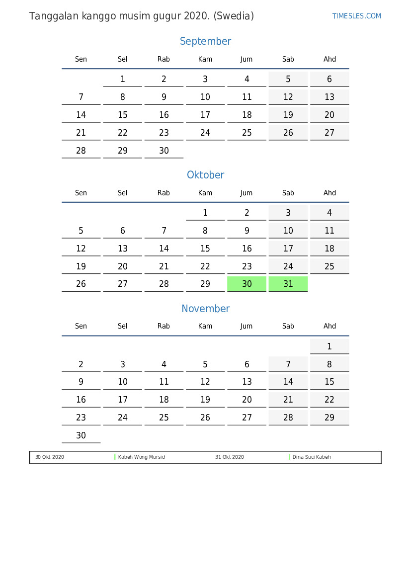 Download lan nyithak tanggalan PDF kanthi preinan lan akhir minggu kanggo musim gugur taun 2020 kanggo Swedia
