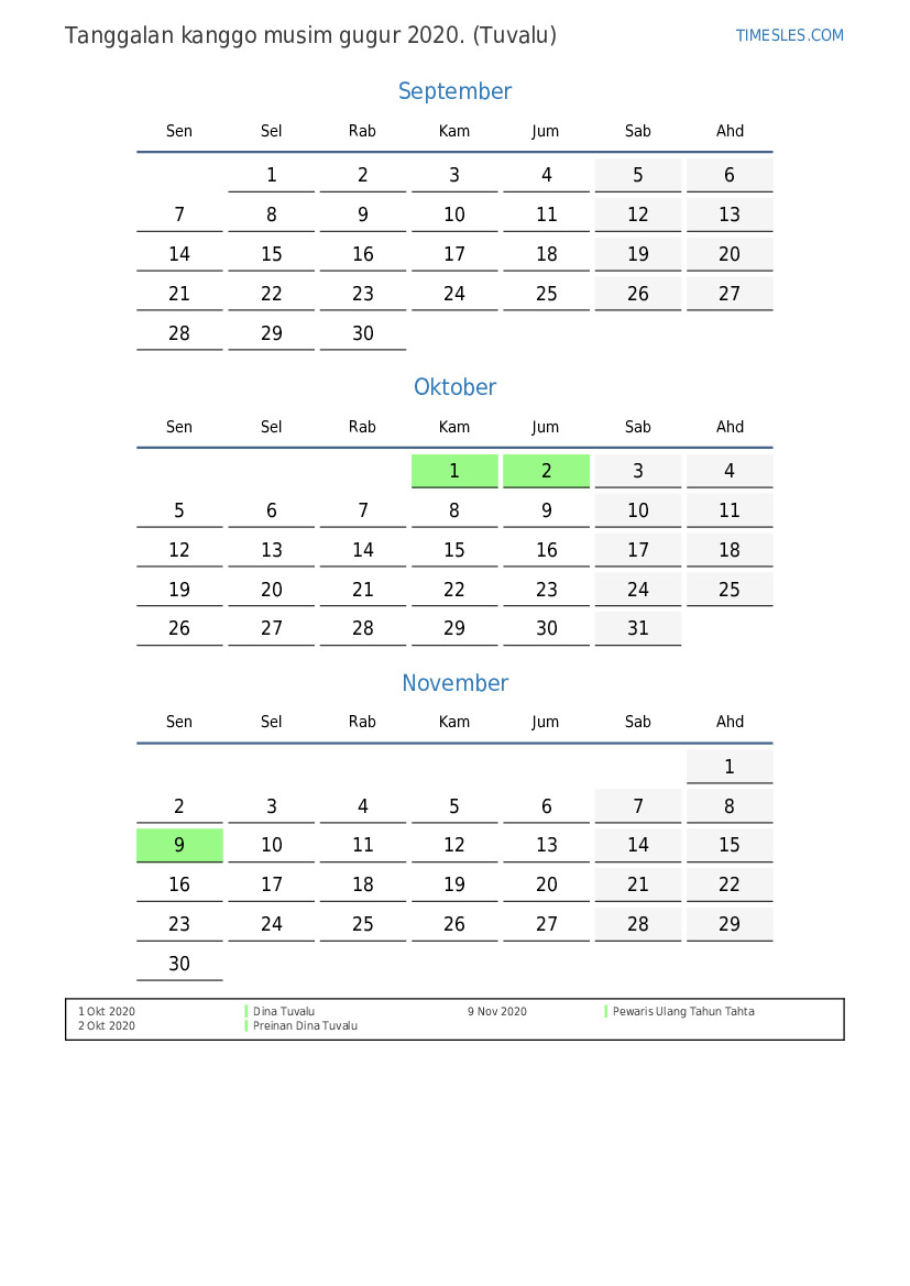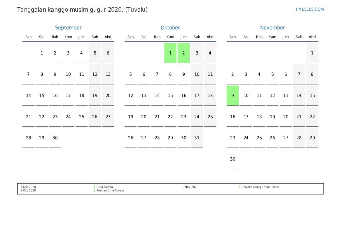 Kalender preinan lan akhir minggu kanggo musim gugur taun 2020 kanggo Tuvalu
