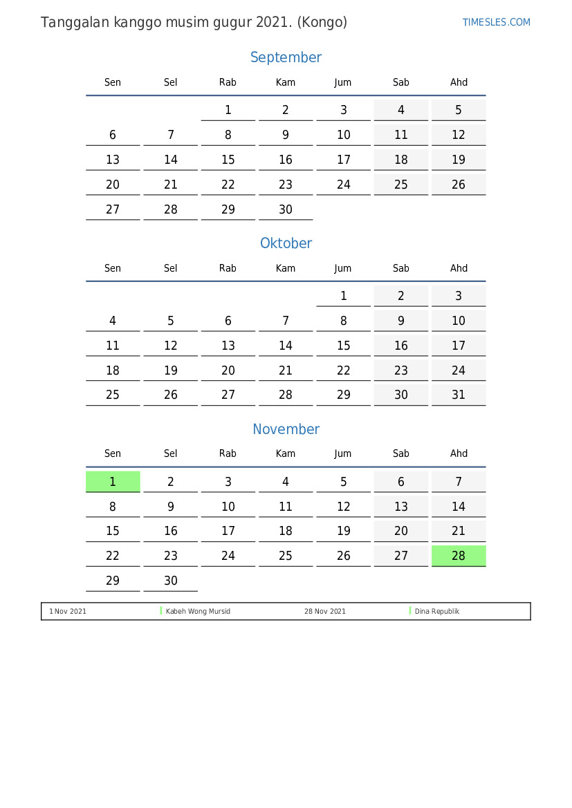 Download lan nyithak tanggalan PDF kanthi preinan lan akhir minggu kanggo musim gugur taun 2021 kanggo Kongo