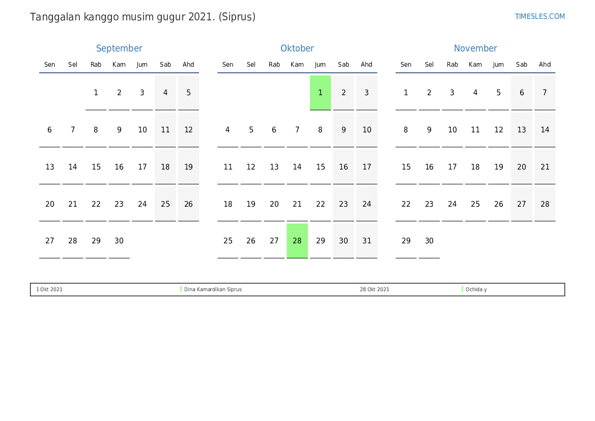Download lan nyithak tanggalan PDF kanthi preinan lan akhir minggu kanggo musim gugur taun 2021 kanggo Siprus