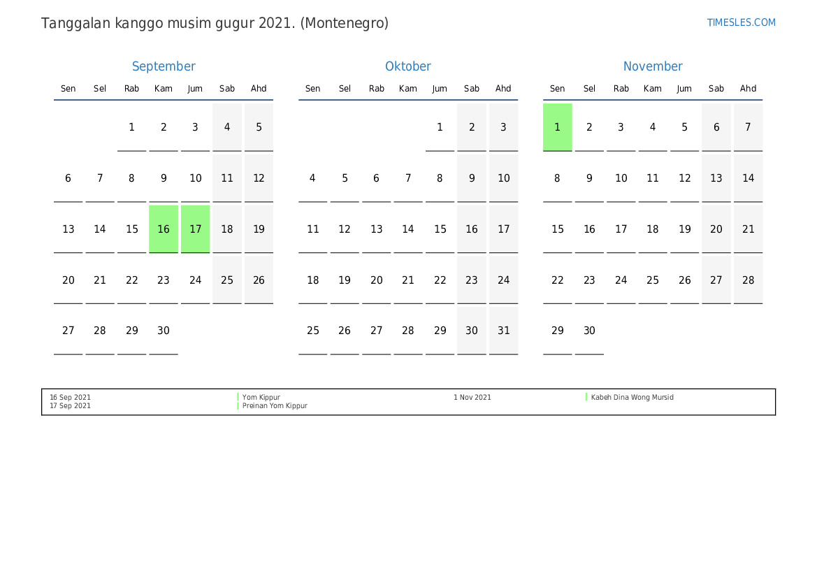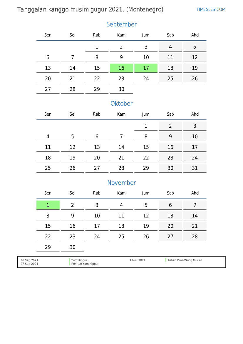 Download lan nyithak tanggalan PDF kanthi preinan lan akhir minggu kanggo musim gugur taun 2021 kanggo Montenegro