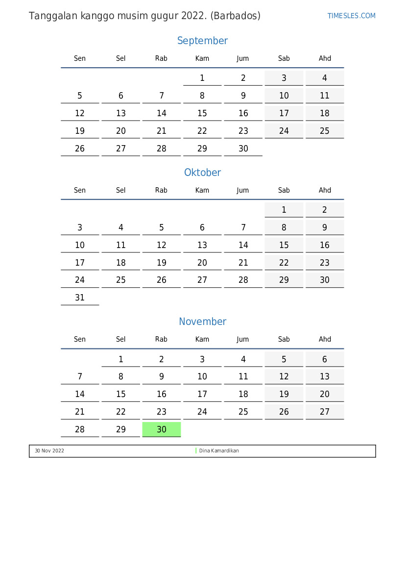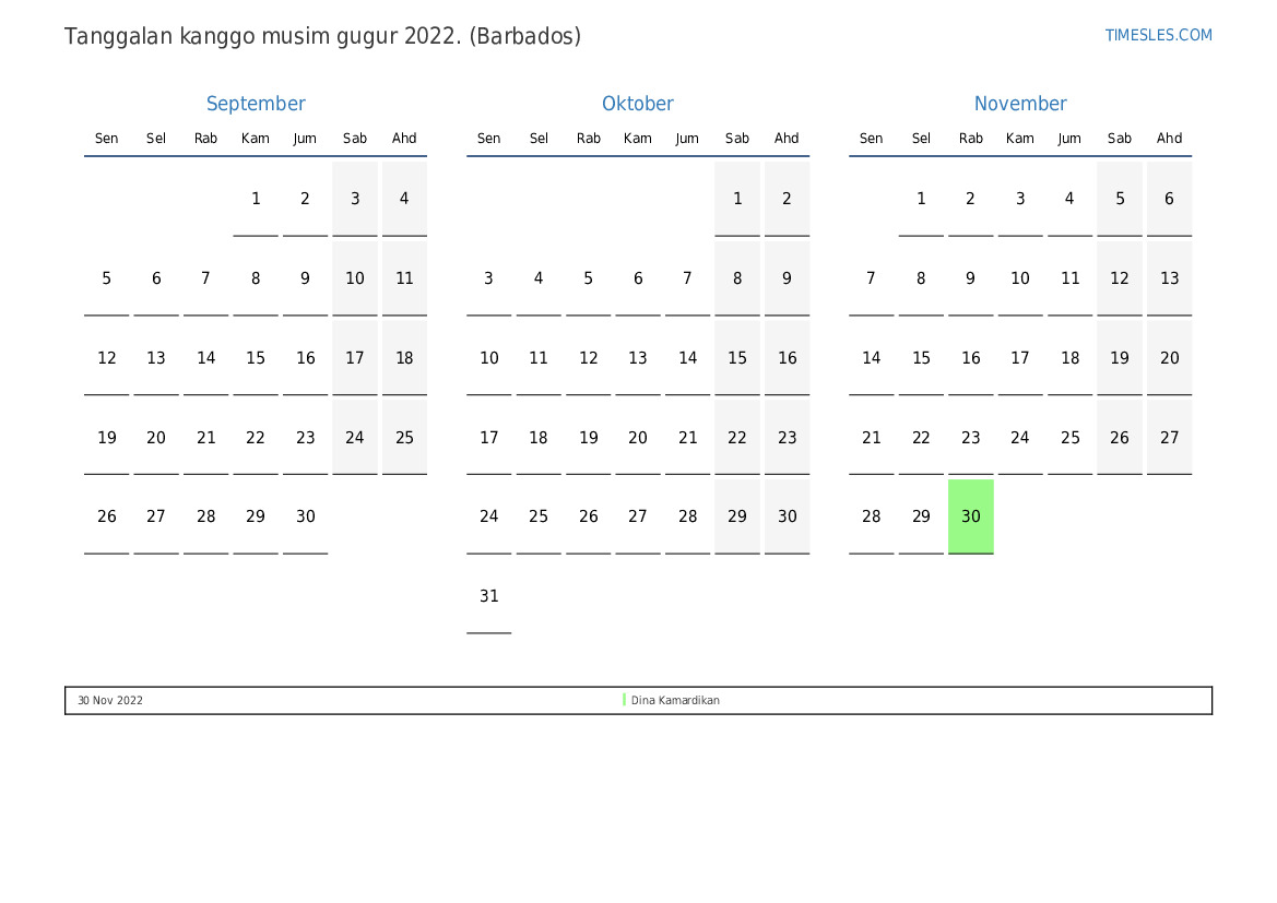 Download lan nyithak tanggalan PDF kanthi preinan lan akhir minggu kanggo musim gugur taun 2022 kanggo Barbados