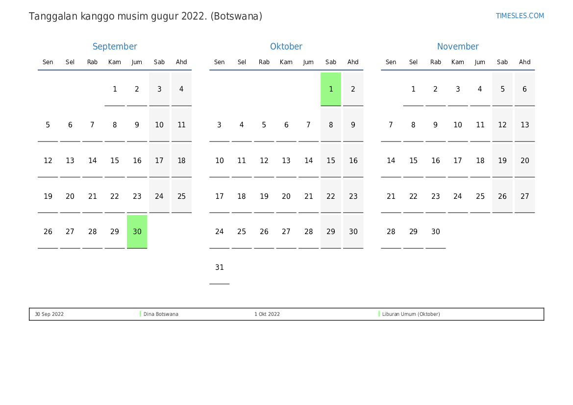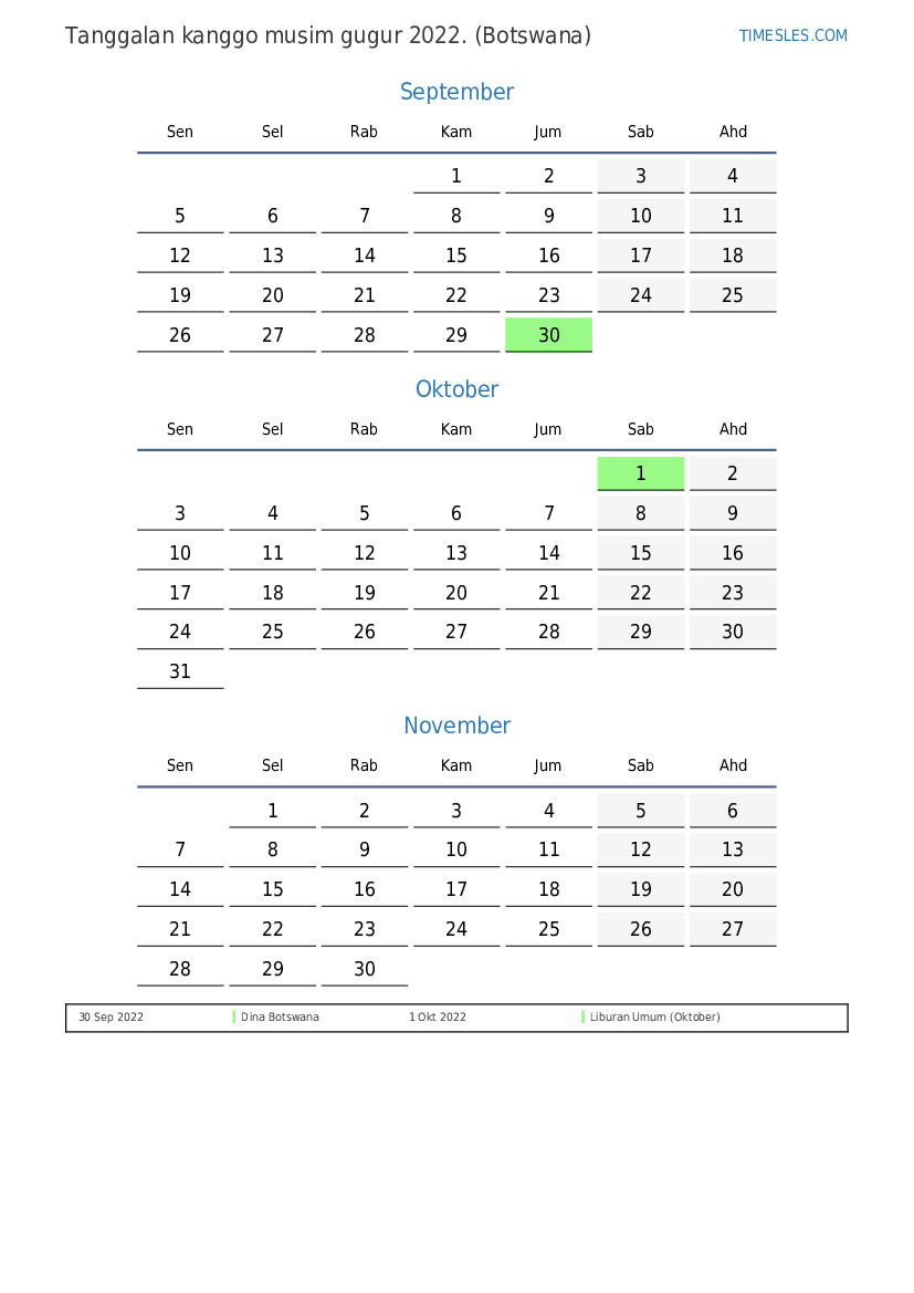 Download lan nyithak tanggalan PDF kanthi preinan lan akhir minggu kanggo musim gugur taun 2022 kanggo Botswana