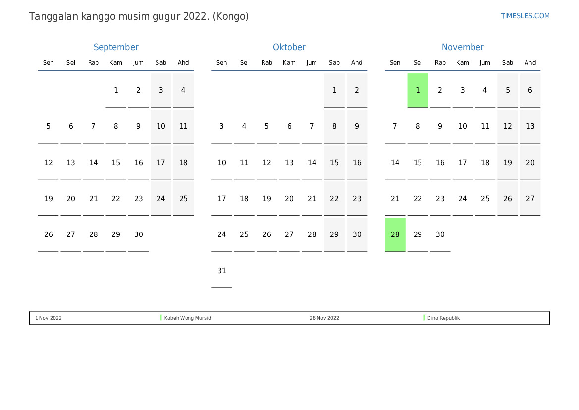 Download lan nyithak tanggalan PDF kanthi preinan lan akhir minggu kanggo musim gugur taun 2022 kanggo Kongo