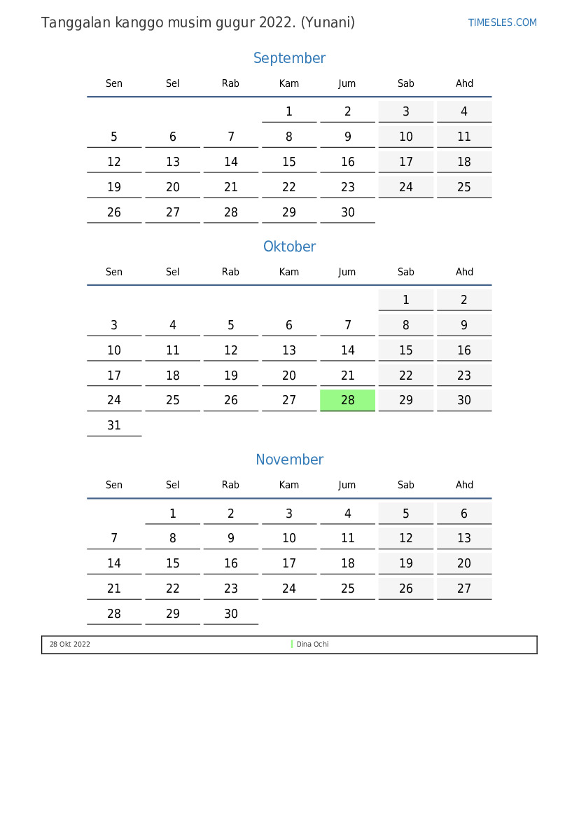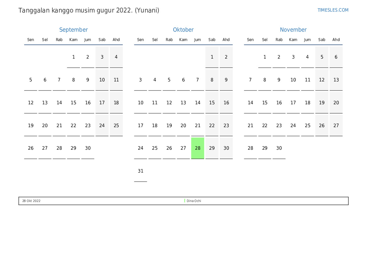 Download lan nyithak tanggalan PDF kanthi preinan lan akhir minggu kanggo musim gugur taun 2022 kanggo Yunani