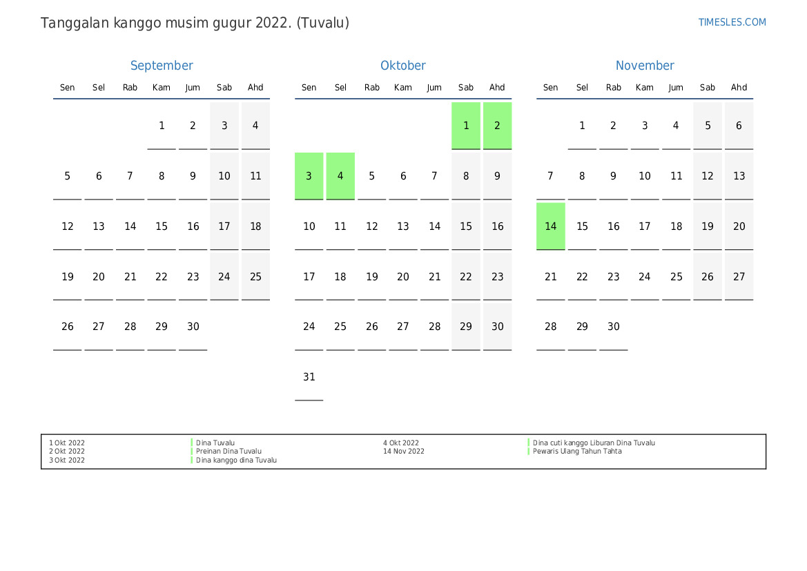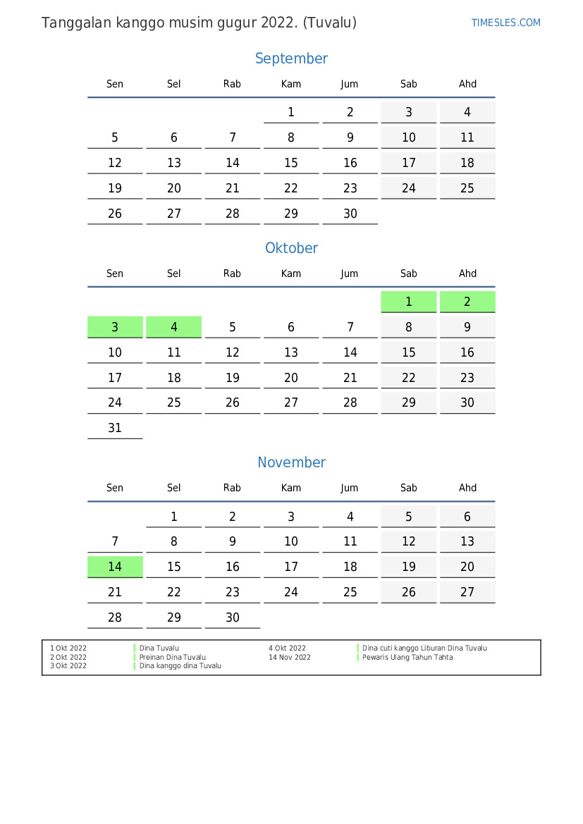 Download lan nyithak tanggalan PDF kanthi preinan lan akhir minggu kanggo musim gugur taun 2022 kanggo Tuvalu
