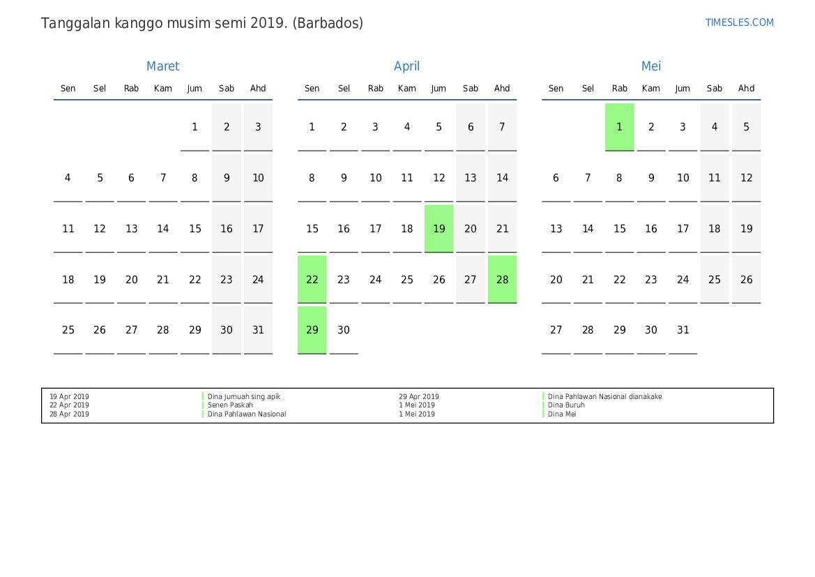 Download lan nyithak tanggalan PDF kanthi preinan lan akhir minggu kanggo musim semi taun 2019 kanggo Barbados