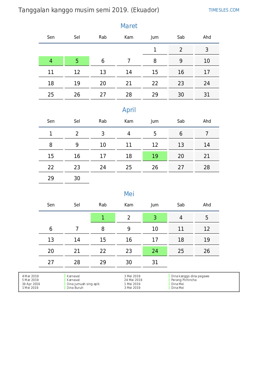 Download lan nyithak tanggalan PDF kanthi preinan lan akhir minggu kanggo musim semi taun 2019 kanggo Ekuador