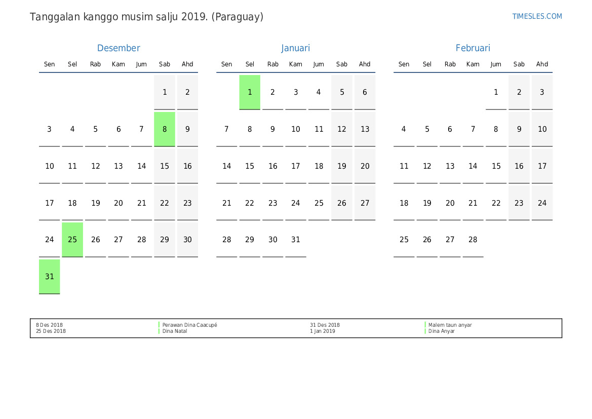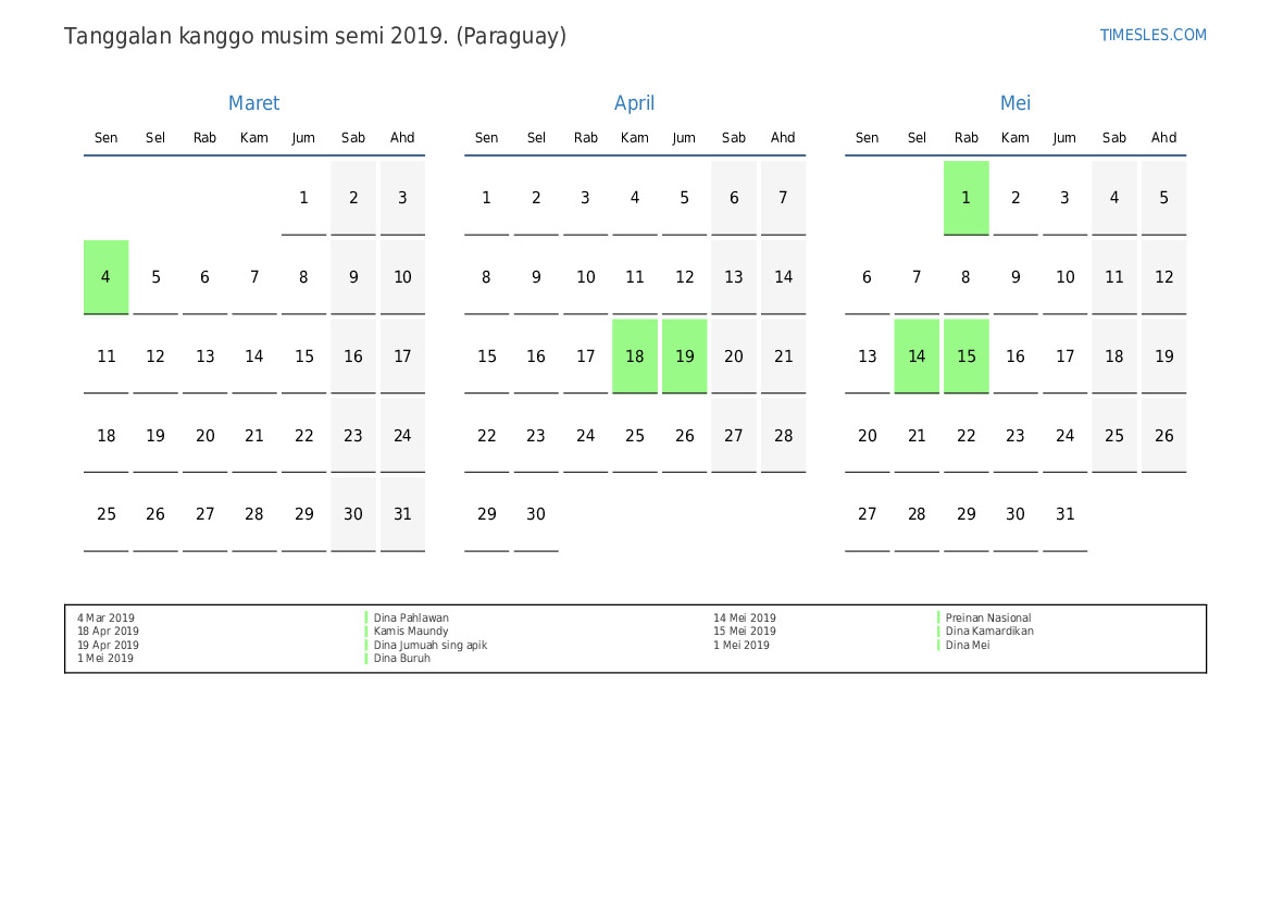 Kalender preinan lan akhir minggu kanggo musim semi taun 2019 kanggo Paraguay