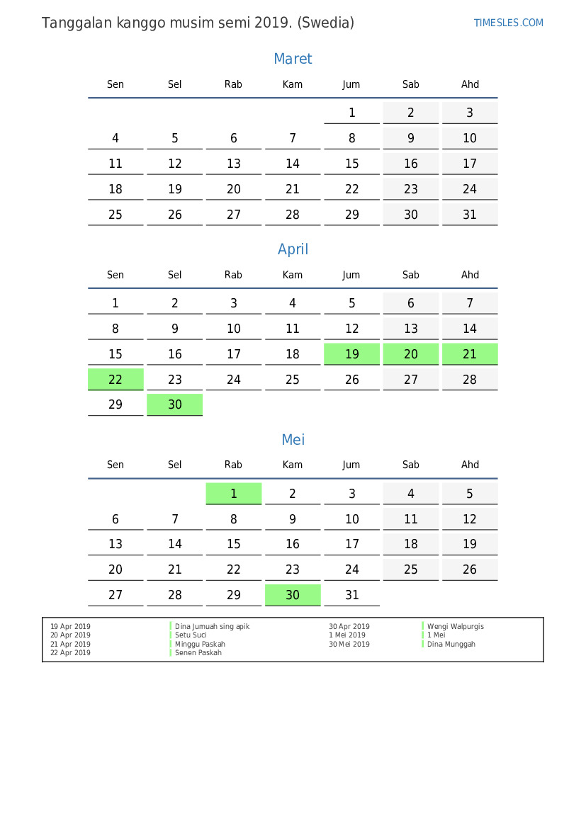 Download lan nyithak tanggalan PDF kanthi preinan lan akhir minggu kanggo musim semi taun 2019 kanggo Swedia