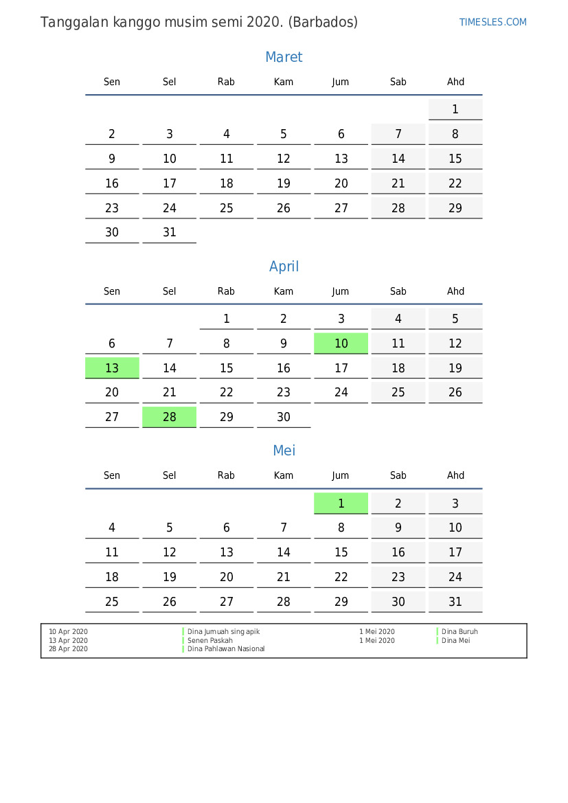 Download lan nyithak tanggalan PDF kanthi preinan lan akhir minggu kanggo musim semi taun 2020 kanggo Barbados
