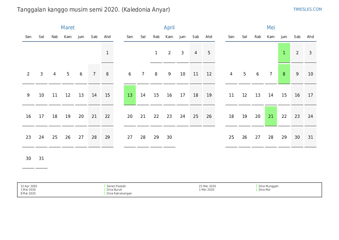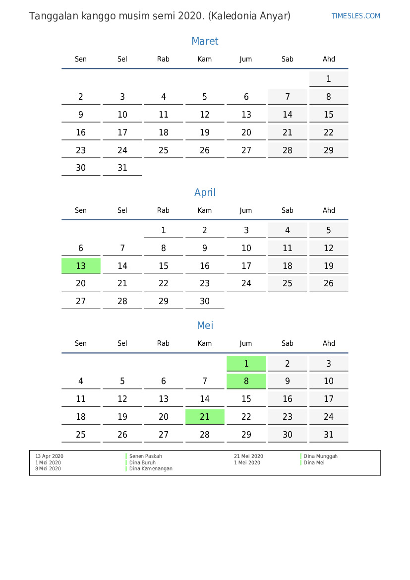 Download lan nyithak tanggalan PDF kanthi preinan lan akhir minggu kanggo musim semi taun 2020 kanggo Kaledonia Anyar