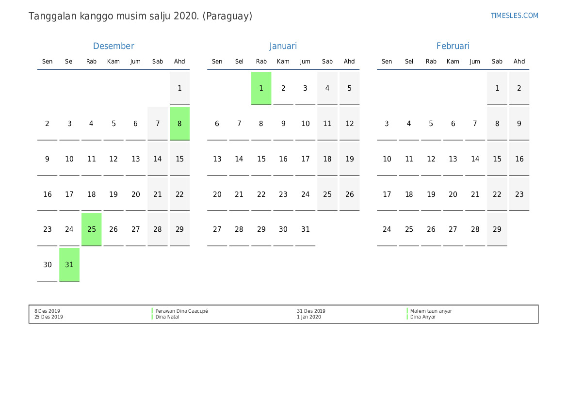 Ing musim semi 2020, ana 9 preinan lan dina dina ing Paraguay. Spring 2020 diwiwiti dina Minggu lan rampung dina Minggu.