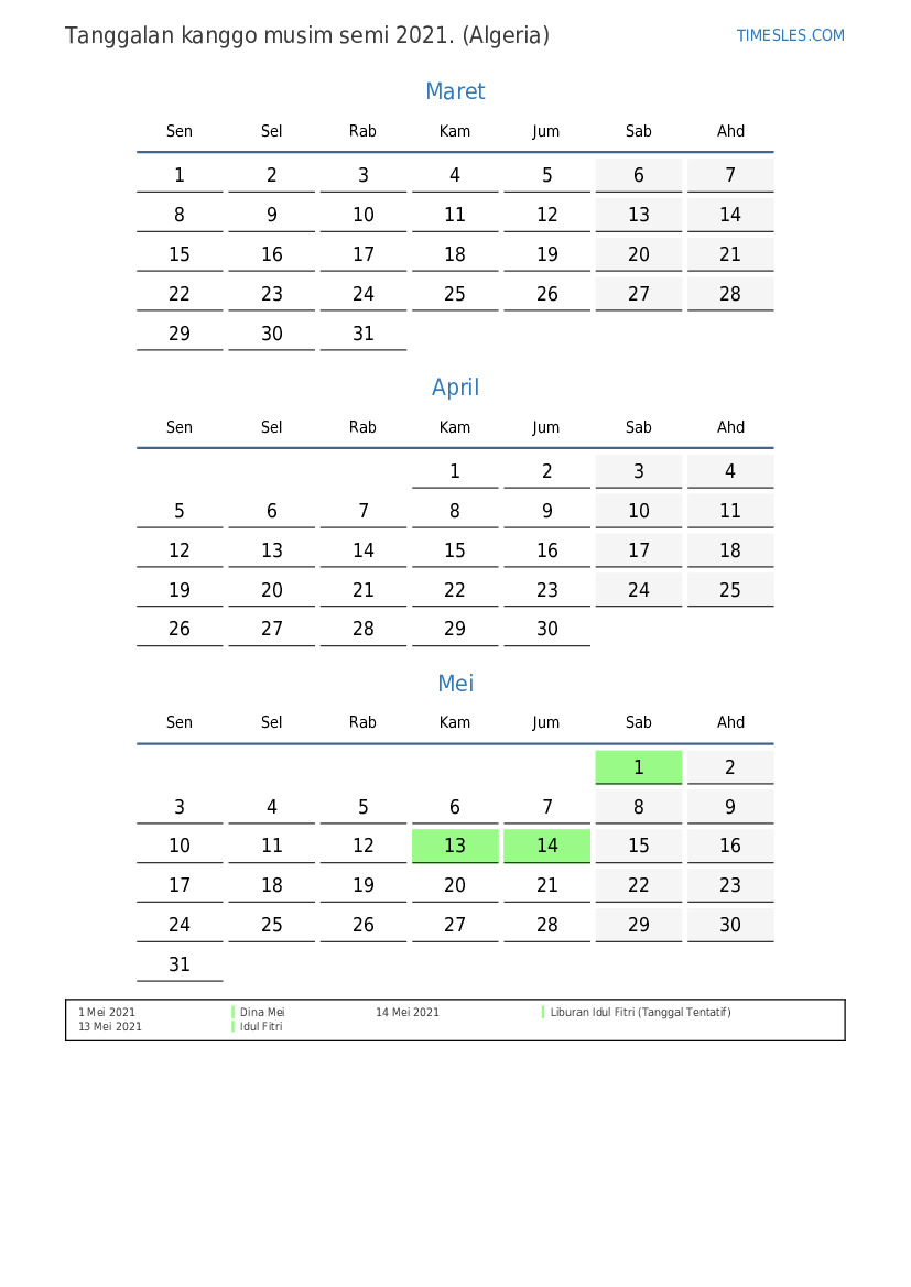 Download lan nyithak tanggalan PDF kanthi preinan lan akhir minggu kanggo musim semi taun 2021 kanggo Algeria