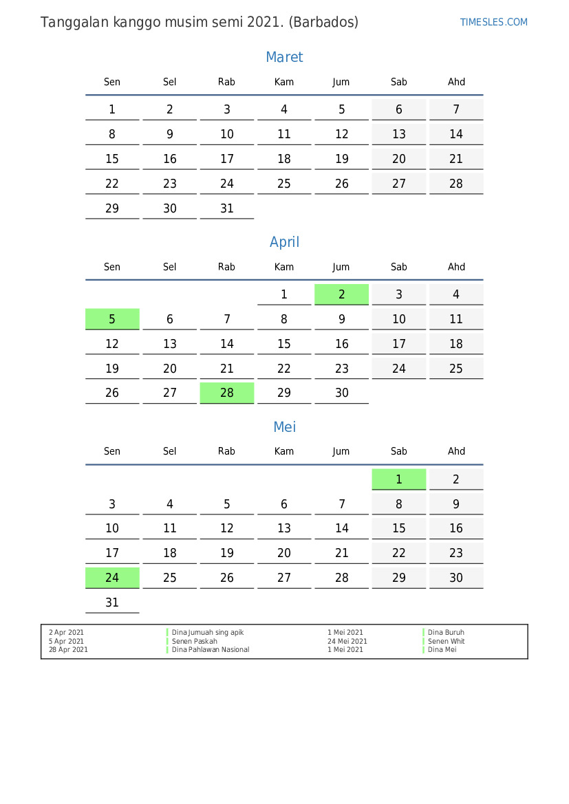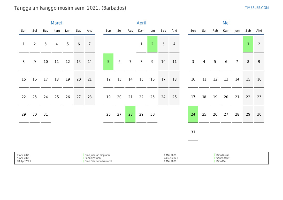 Download lan nyithak tanggalan PDF kanthi preinan lan akhir minggu kanggo musim semi taun 2021 kanggo Barbados