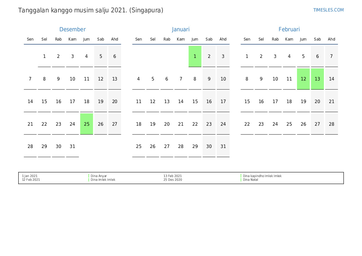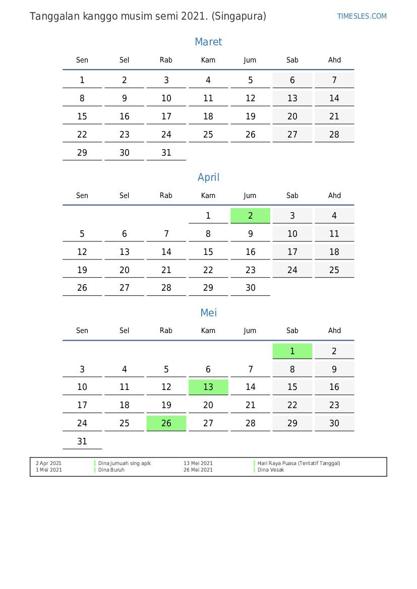 Kalender preinan lan akhir minggu kanggo musim semi taun 2021 kanggo Singapura